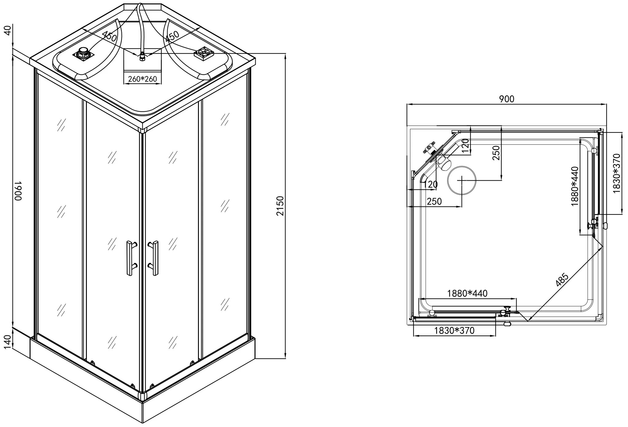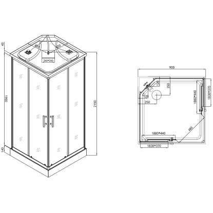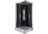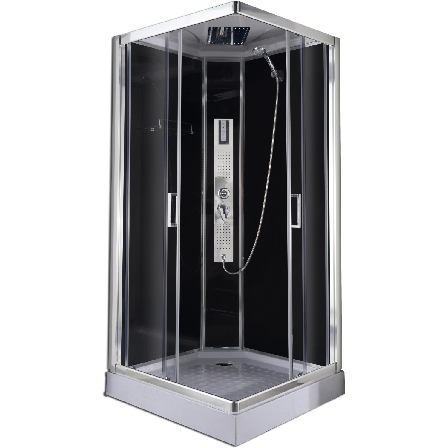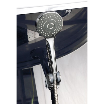 Sprchový kout s chromovanými profily má dveře z 5 mm silného bezpečnostního skla a zadní stěnu z 4 mm silného skla v černé barvě. Zadní panel je vybaven pevně zabudovaným nerezovým masážním panelem. Dveře jsou doplněny dvojitými kolečky a madly ve vzhledu chromu. Sprchová vanička z ABS akrylátu je vysoká 14 cm.