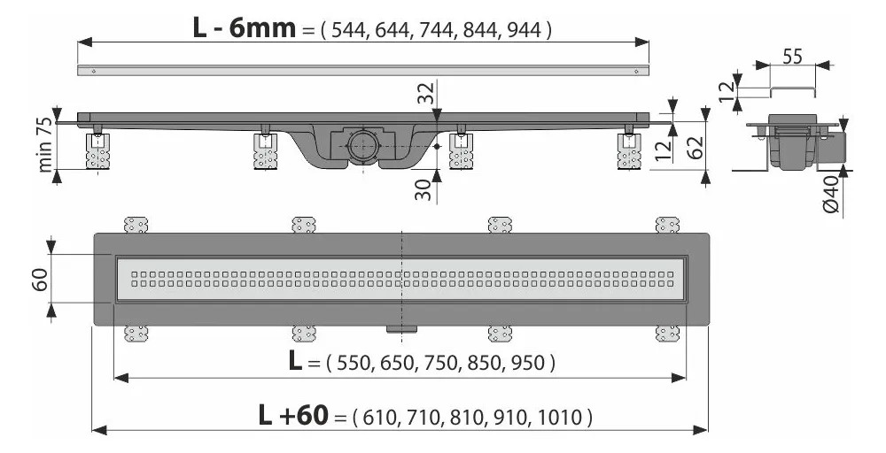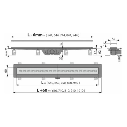 Alcadrain Liniový podlahový žlab plastový KOMFORT typ 2, 950 mm