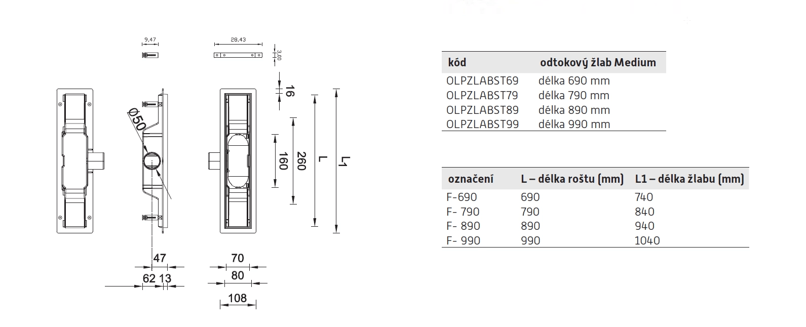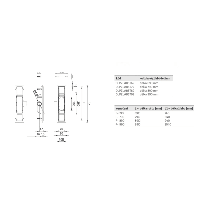 Odtokový žlab je k dispozici v délce od 440 mm do 1040 mm s roštem v základním provedení MEDIUM od 390 mm do 990 mm. Pouze na objednávku také další varianty roštu BASIC, DROPS, HARMONY, FLOOR a KLASSZIK.