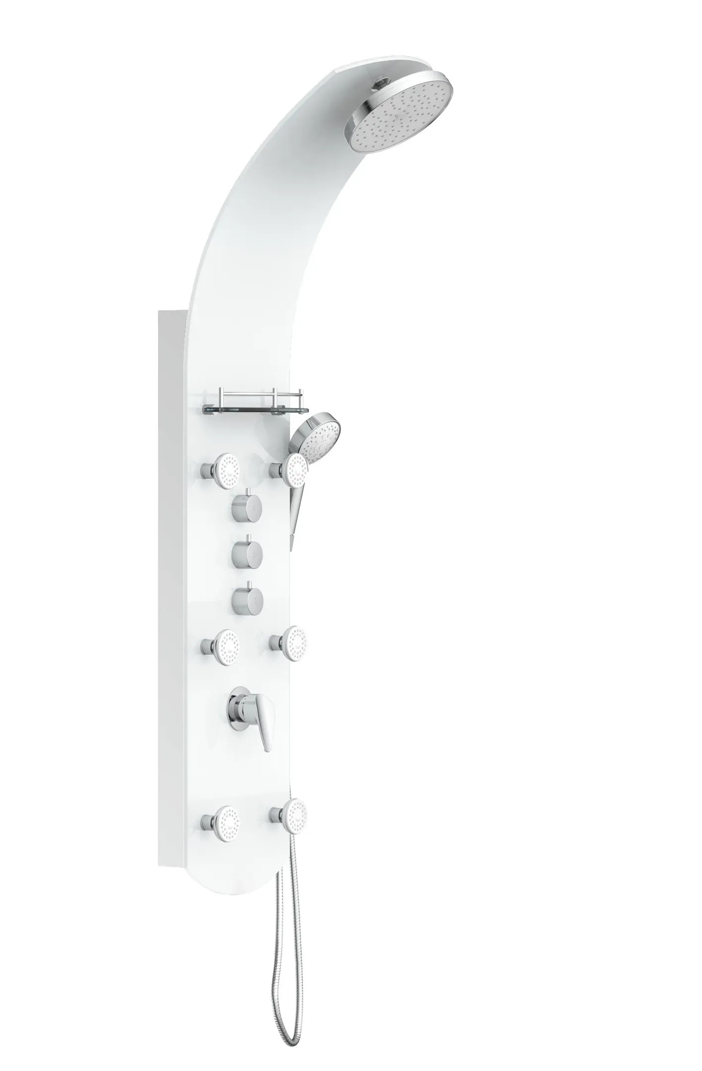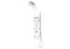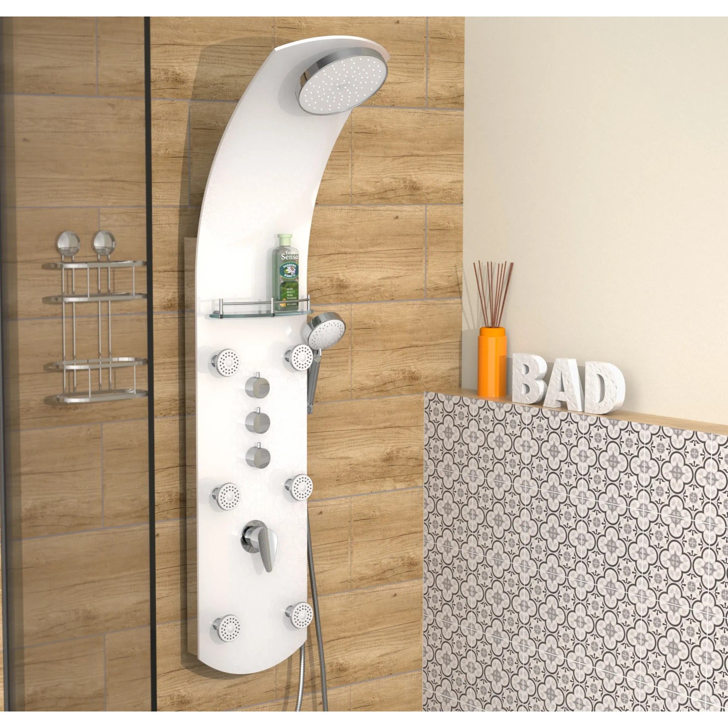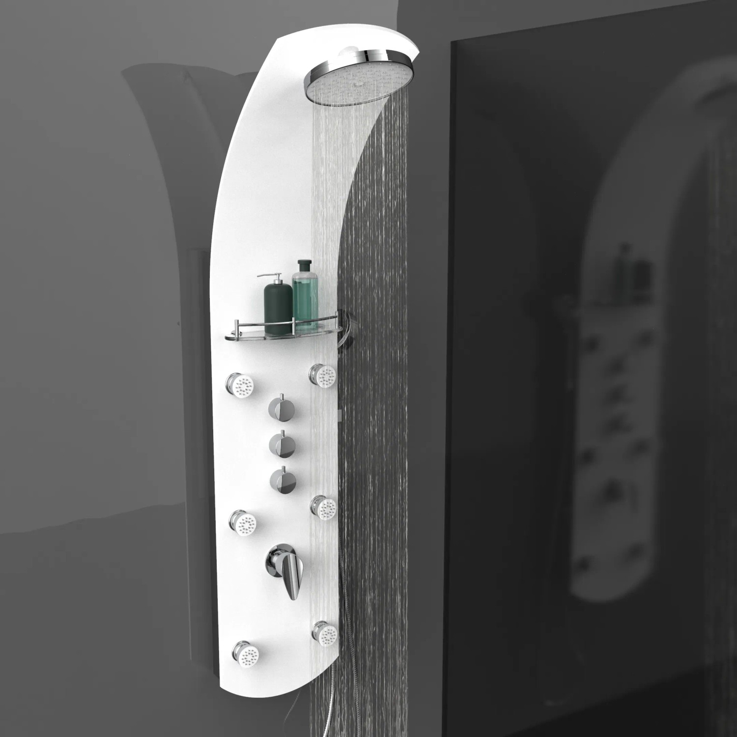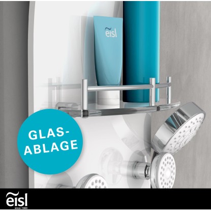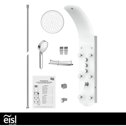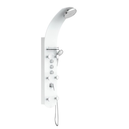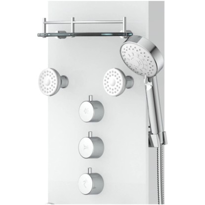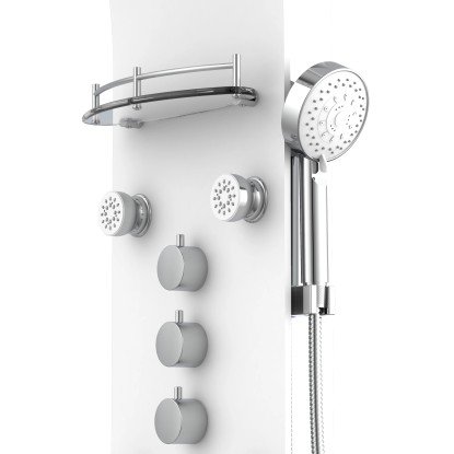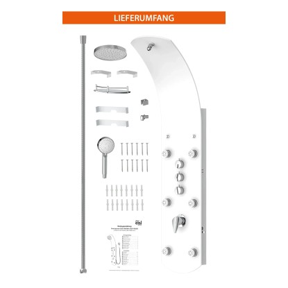Exkluzivní sprchový panel z vysoce kvalitního, bílého bezpečnostního skla, upoutá pozornost každého, kdo vstoupí do Vaší koupelny. Zažijete čistou relaxaci díky horní sprše, ruční sprše a šesti nastavitelnými zádovými tryskami, začnete nový den svěže s velkoformátovou wellness hlavovou sprchou nebo se večer necháte hýčkat doplňkovými zádovými tryskami. Pomocí tří samostatně nastavitelných ventilů můžete v závislosti na typu sprchy snadno přepínat mezi sprchovými zdroji. Sprchový panel je vybaven i jednopákovou bateriií s nehlučnou kartuší s odolným keramickým těsněním. Elegantní skleněné police s nerezovým zábradlím nabízí dostatek úložného prostoru a bezpečné uchycení sprchového náčiní. Knoflíky proti vodnímu kameni na sprchových hlavicích usnadní odstranění zbytků vodního kamene. Díky kompletní montážní sadě a snadno srozumitelnému návodu k montáži hravě zvládnete instalaci.