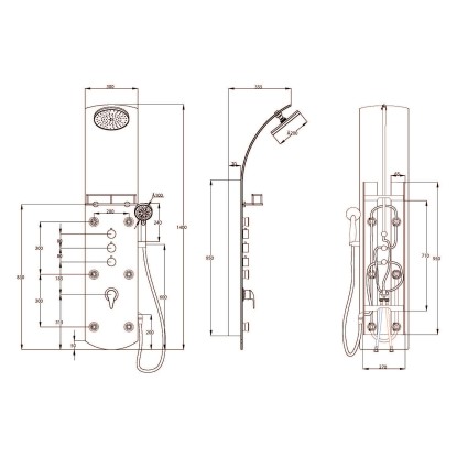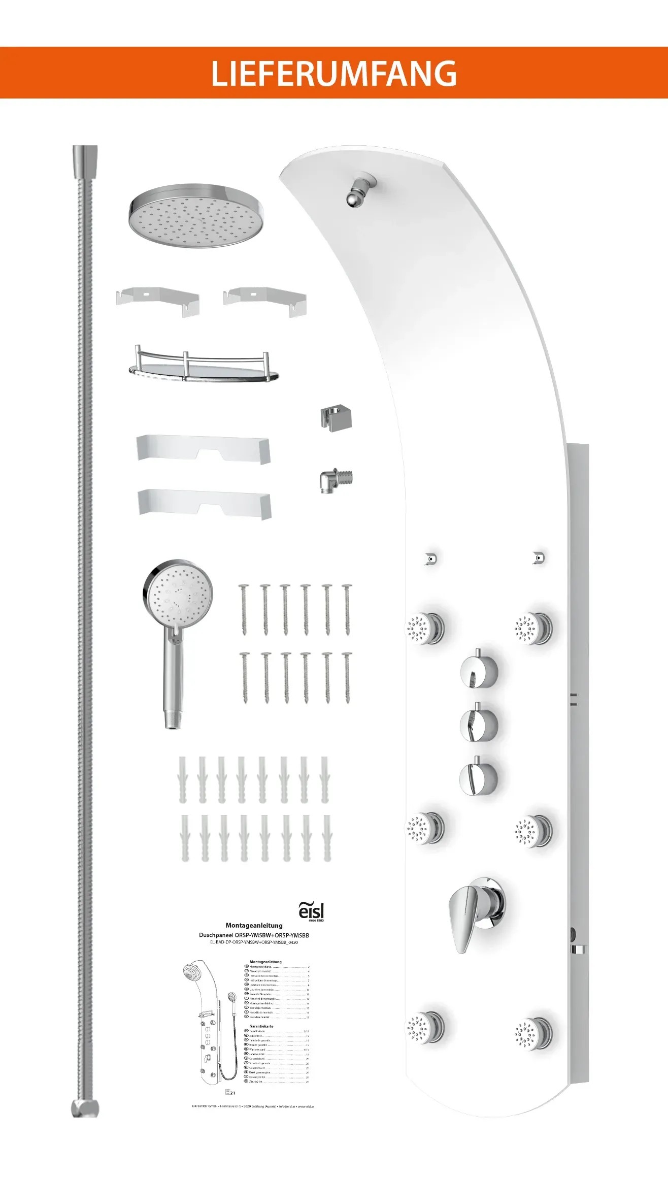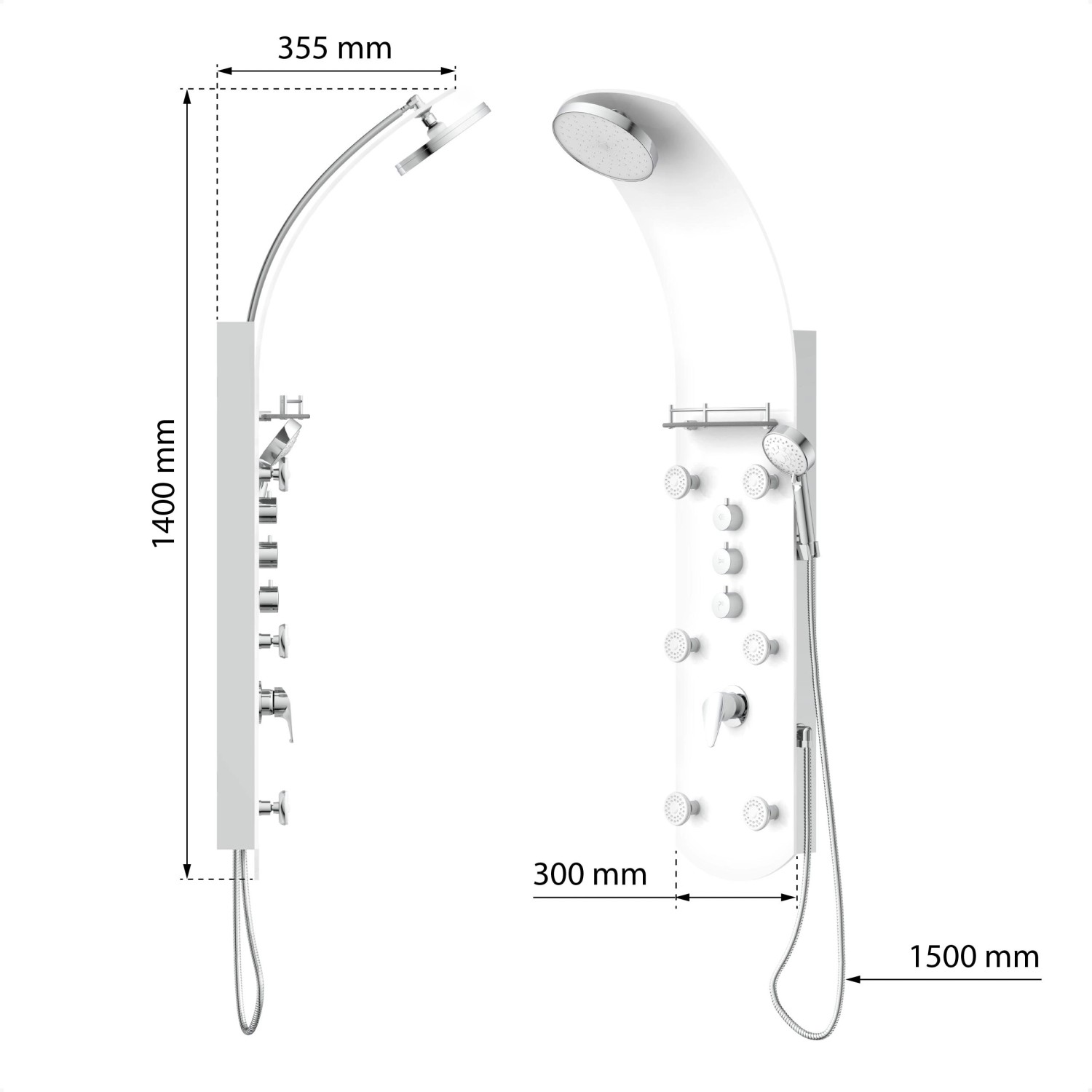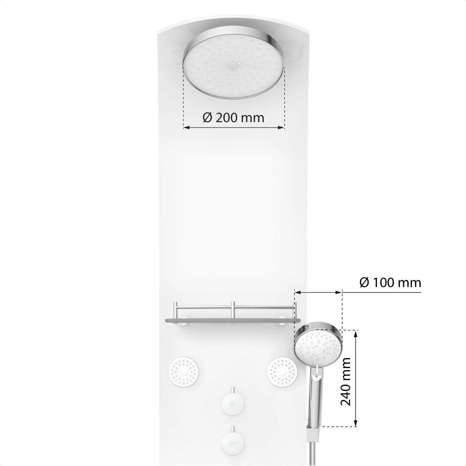 Exkluzivní sprchový panel z vysoce kvalitního, bílého bezpečnostního skla, upoutá pozornost každého, kdo vstoupí do Vaší koupelny. Zažijete čistou relaxaci díky horní sprše, ruční sprše a šesti nastavitelnými zádovými tryskami, začnete nový den svěže s velkoformátovou wellness hlavovou sprchou nebo se večer necháte hýčkat doplňkovými zádovými tryskami. Pomocí tří samostatně nastavitelných ventilů můžete v závislosti na typu sprchy snadno přepínat mezi sprchovými zdroji. Sprchový panel je vybaven i jednopákovou bateriií s nehlučnou kartuší s odolným keramickým těsněním. Elegantní skleněné police s nerezovým zábradlím nabízí dostatek úložného prostoru a bezpečné uchycení sprchového náčiní. Knoflíky proti vodnímu kameni na sprchových hlavicích usnadní odstranění zbytků vodního kamene. Díky kompletní montážní sadě a snadno srozumitelnému návodu k montáži hravě zvládnete instalaci.