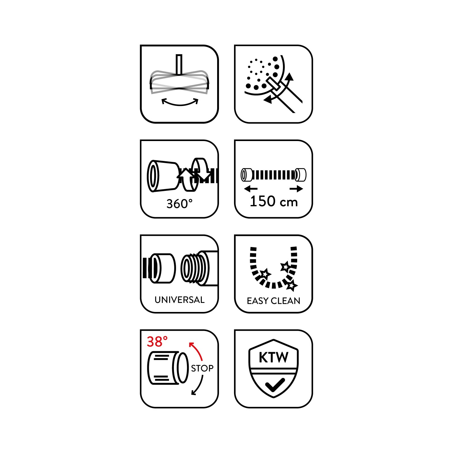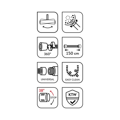 Hadice o délce 150 cm je opatřena 360° ochranou proti překroucení, což zabraňuje zauzlování v jakékoli časti hadice. Hladký povrch hadice umožňuje snadné a rychlé čištění "EASY CLEAN". Termostatická baterie po nastavení udržuje stálou komfortní teplotu.