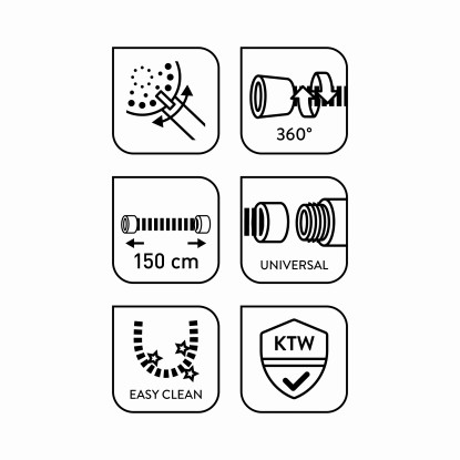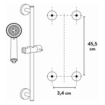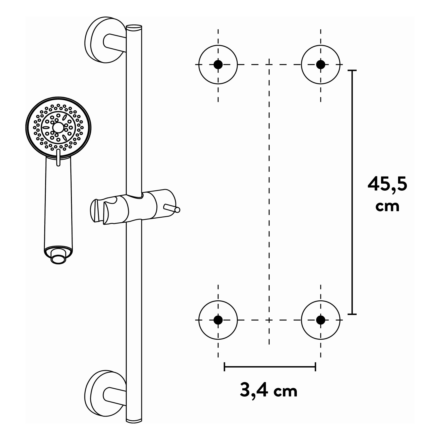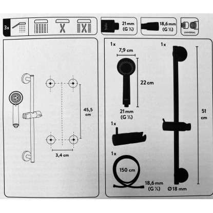 Tento set se skládá z ruční sprchy se 3 proudy, plastové sprchové hadice v černé matné barvě, 150 cm dlouhé hadice. Sprchová tyč má delku 51 cm, průmer 18 mm, s posuvným držákem. Lze upevnit pomocí šroubu nebo přilepit. Včetně montážního materiálu sestávajícího ze šroubu a hmoždinek, lepidlo není součástí.