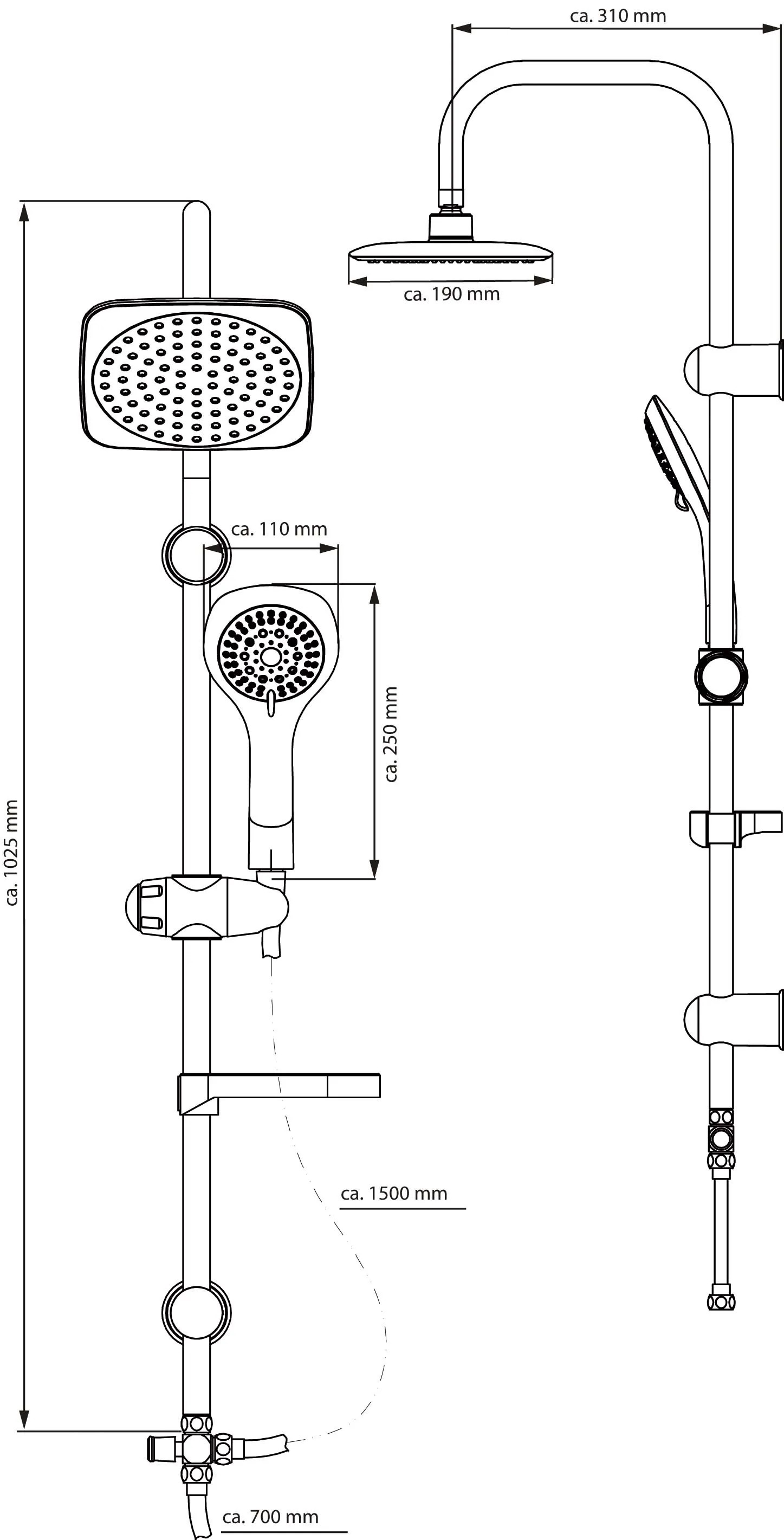 Myšlenka, že je koupelna pouze místem pro každodenní hygienu, je již dávno minulostí. Sada s hlavovou sprchou Duschtraum s moderním designem se elegantně začlení do koupelny v mnoha stylech. Kvalitní sprchový sloup má výškově nastavitelnou sprchovou tyč z nerezové oceli 102 cm a plastovou sprchovou hadici cca 150 cm se standardní přípojkou 1/2 palce a také plastovou připojovací hadici cca 70 cm se standardní přípojkou 1/2 palce. Díky tomu ji lze bez problémů namontovat do všech běžných sprch, stávající vyvrtané otvory lze využít díky výškově nastavitelnému nástěnnému držáku. Součástí dodávky je samozřejmě i kompletní montážní sada se snadno srozumitelným návodem.