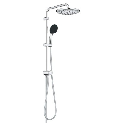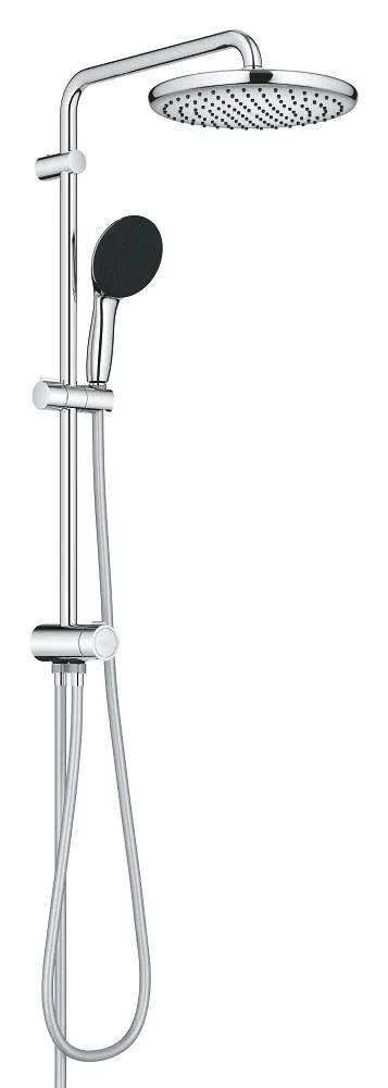 Tento sprchový systém VITALIO START 250 Flex představuje jednoduchý způsob, jak změnit zážitek ze sprchování a vzhled vaší koupelny. Exponovaný systém pro montáž na stěnu se skládá z 250 mm hlavové sprchy, 110 mm ruční sprchy, přepínače pro snadné přepínání mezi hlavovou a ruční sprchou nebo dvěma proudy hlavové sprchy, sprchové lišty s 390 mm sprchovým ramenem a posuvným prvkem pro nastavení ruční sprchy a 1500 mm a 1250 mm hadice.