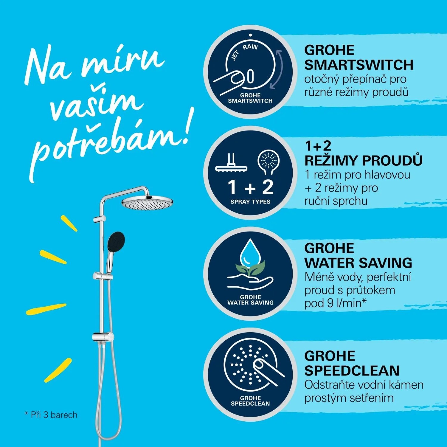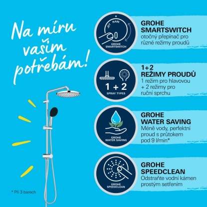 Hlavová sprcha nabízí jemný, relaxační proud Rain Spray nebo SmartRain, který nabízí podobnou úroveň komfortu, ale se sníženým průtokem. Ruční sprcha se dodává se silikonovým kroužkem ShockProof, který ji chrání před pádem nebo nárazem. Má 2 druhy proudu, jemný Rain a výkonný, cílený Jet Spray. K oběma je snadný přístup pomocí inovativního přepínače GROHE SmartSwitch na zadní straně sprchové hlavice. A omezovač průtoku GROHE Water Saving výrazně snižuje spotřebu vody, aniž by to bylo na úkor výkonu. Technologie GROHE DreamSpray navíc zajišťuje vyvážený proud vody ze všech trysek. Vaše sprcha tak bude maximálně komfortní a plná prožitku. Silikonové trysky SpeedClean jsou navrženy tak, aby se pouhým otřením zbavily vodního kamene.