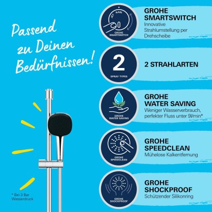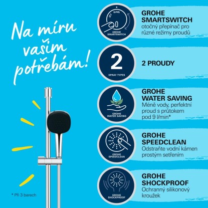 Sprchový set GROHE VITALIO COMFORT 110 nabízí novou úroveň pohodlí a bezpečnosti v koupelně. 110 mm ruční sprcha má 2 proudy pro různé okamžiky: uklidňující Rain zmírňuje stres, zatímco soustředěný Jet je ideální pro oplachování vlasů po šamponování. K oběma je snadný přístup pomocí inovativního přepínače GROHE SmartSwitch na zadní straně sprchové hlavice. Technologie GROHE DreamSpray přizpůsobuje proud vody z každé trysky a zajišťuje tak rovnoměrné stříkání. Je také úsporná díky omezovači průtoku GROHE Water Saving, který výrazně snižuje spotřebu vody, aniž by to bylo na úkor výkonu. Doporučuje se tlak minimálně 1,0 bar GROHE SpeedClean umožňuje vyčistit trysky od vodního kamene pouhým prstem.