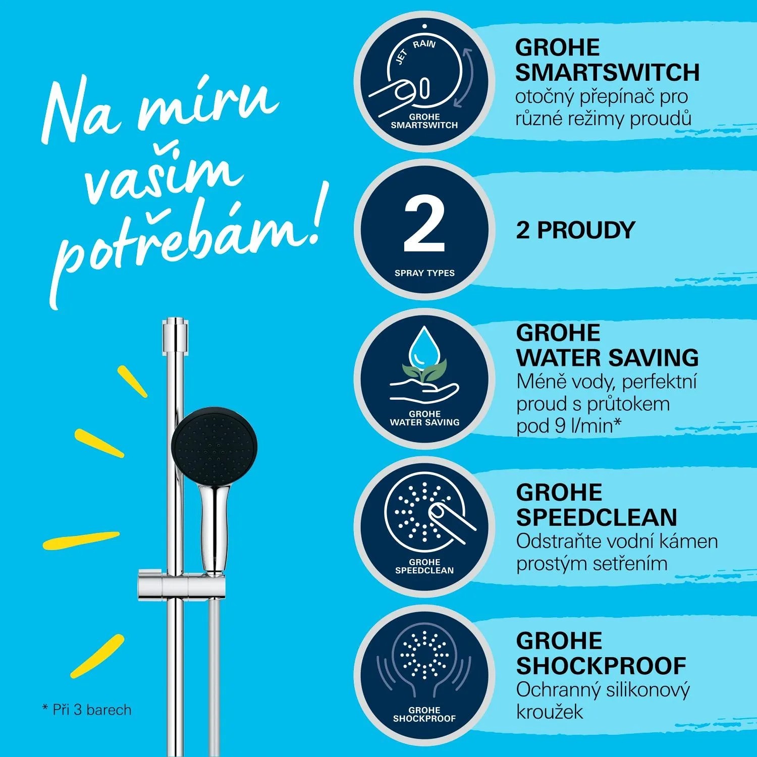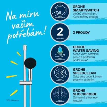 SPRCHOVÝ SET GROHE VITALIO START 110 SE VŠEMI FUNKCEMI A CHYTRÝM DESIGNEM, KTERÝ ZMODERNIZUJE VAŠI KOUPELNU A VAŠE SPRCHOVÁNÍ, JE DOKONALOU VOLBOU PRO VŠECHNY TYPY SPRCH