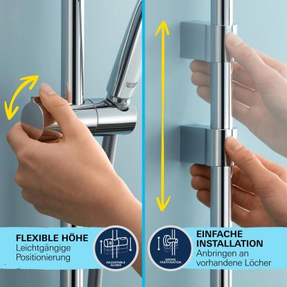 Díky oslnivé, ale odolné povrchové úpravě GROHE Long-Life bude tato sada vypadat bezchybně po dlouhá léta. Není třeba žádné nářadí - díky slibu QUICKFIX je instalace překvapivě snadná! Univerzální montážní systém je vhodný pro všechny standardní sprchové hadice - stačí hadici našroubovat. Matice GROHE ProGrip hadice mají vroubkovaný povrch pro optimální uchopení a snadné utahování. Držák lze přišroubovat (šrouby a hmoždinky jsou součástí dodávky) nebo ještě pohodlněji přilepit! Potřebujete pouze 2 x sadu GROHE QUICKGLUE Set S (41247000, prodává se samostatně). Přídržná síla je max. 20 kg! Pokud potřebujete další pokyny, podívejte se na naše Rychlé video nebo se podívejte na Stručného průvodce.