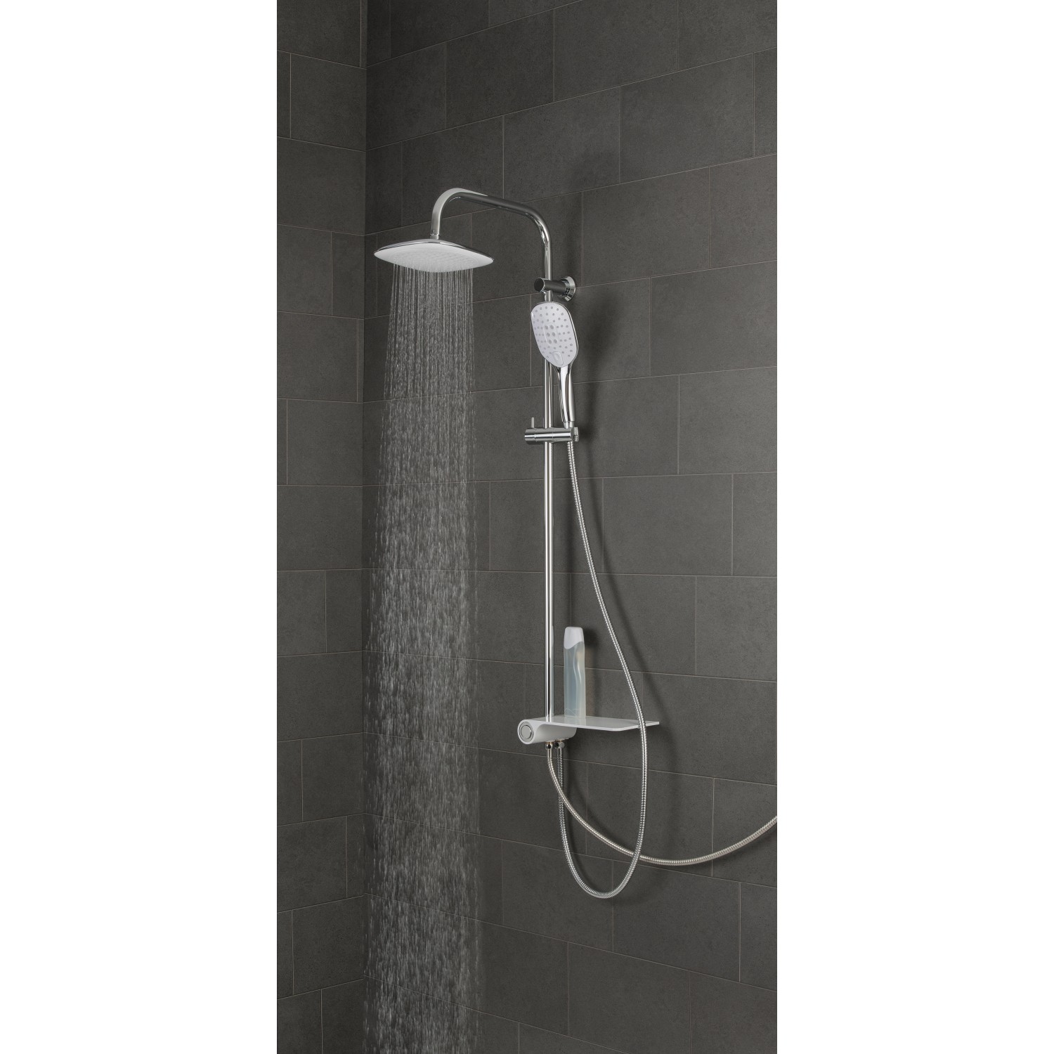 Schütte sada hlavové sprchy Aquastar z kvalitního nerezu se vyznačuje moderním designem a pozoruhodnou kvalitou. Na praktické poličce máte místo na vaše hygienické potřeby. To je skvělé obzvláště do malých sprch. Sada zahrnuje velkoformátovou, plochou sprchovou hlavici a designovou ruční sprchu se 3 typy proudu vody. Díky tomu nestojí po stresujícím dni nic v cestě relaxaci při sprchování. Pomocí přepínacího tlačítka v přihrádce pohodlně přepnete mezi ruční a hlavovou sprchou. Pro rychlé a snadné čištění je ruční i hlavová sprcha opatřena nopky proti usazování vodního kamene. Vápenaté usazeniny zde nemají žádnou šanci a lze je jednoduše odstranit prsty. Přiložené těsnění pro úsporu vody umožňuje úsporu vody až 50 %. Kvalitní sprchová hadice z nerezové oceli a připojovací hadice k baterii jsou dvojitě vinuté a mají standardní přípojku G 1/2. Přísná kontrola kvality a vysoce kvalitní materiály zaručují vysokou bezpečnost a nejlepší kvalitu vody.