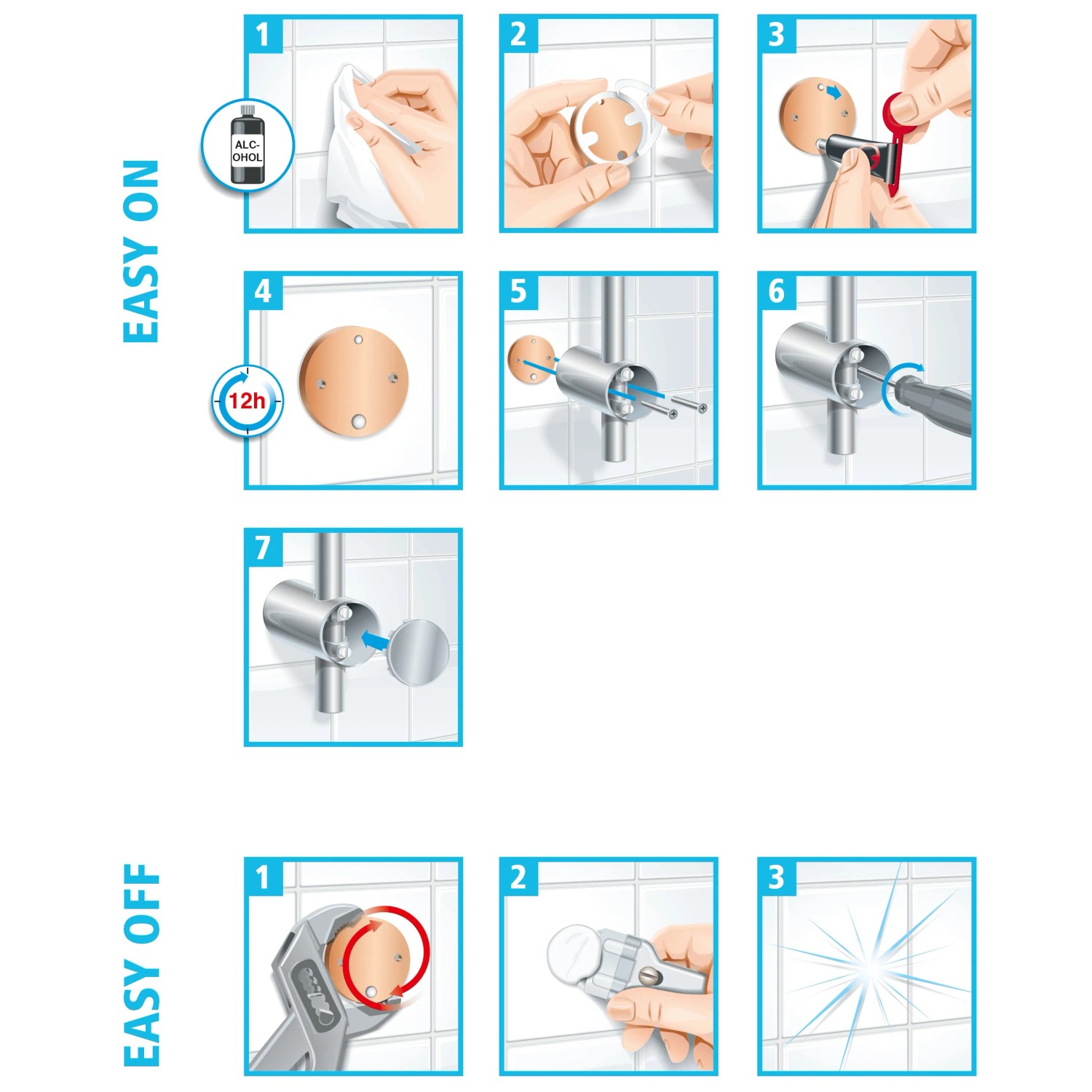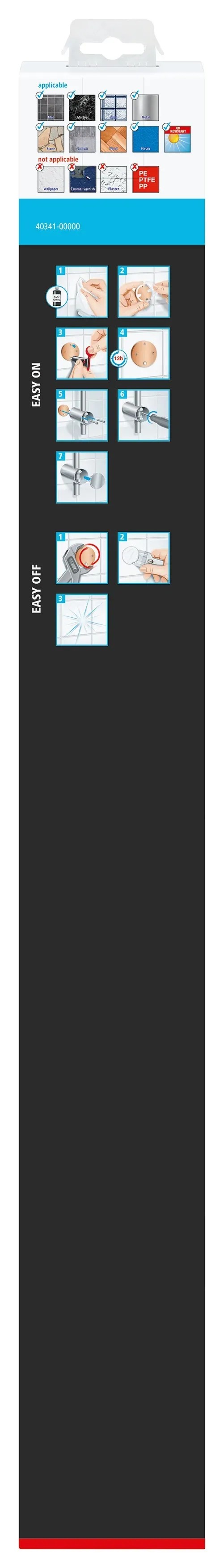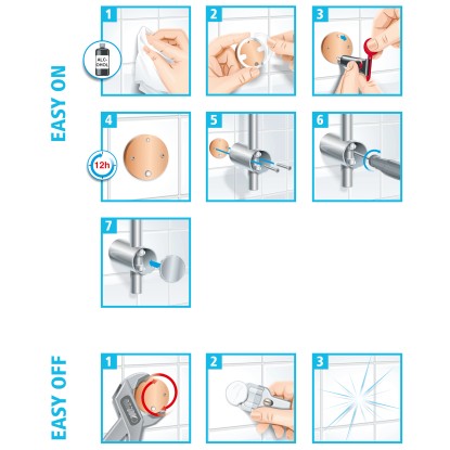 Vrtání není nutné, takže se stěny a obklady nepoškodí. Lepidlo zaschne za 12 hodin. Sloup lze kdykoli rychle a beze stopy odstranit. S novým adaptérem BK30-2 ho lze snadno připevnit na jiném místě.