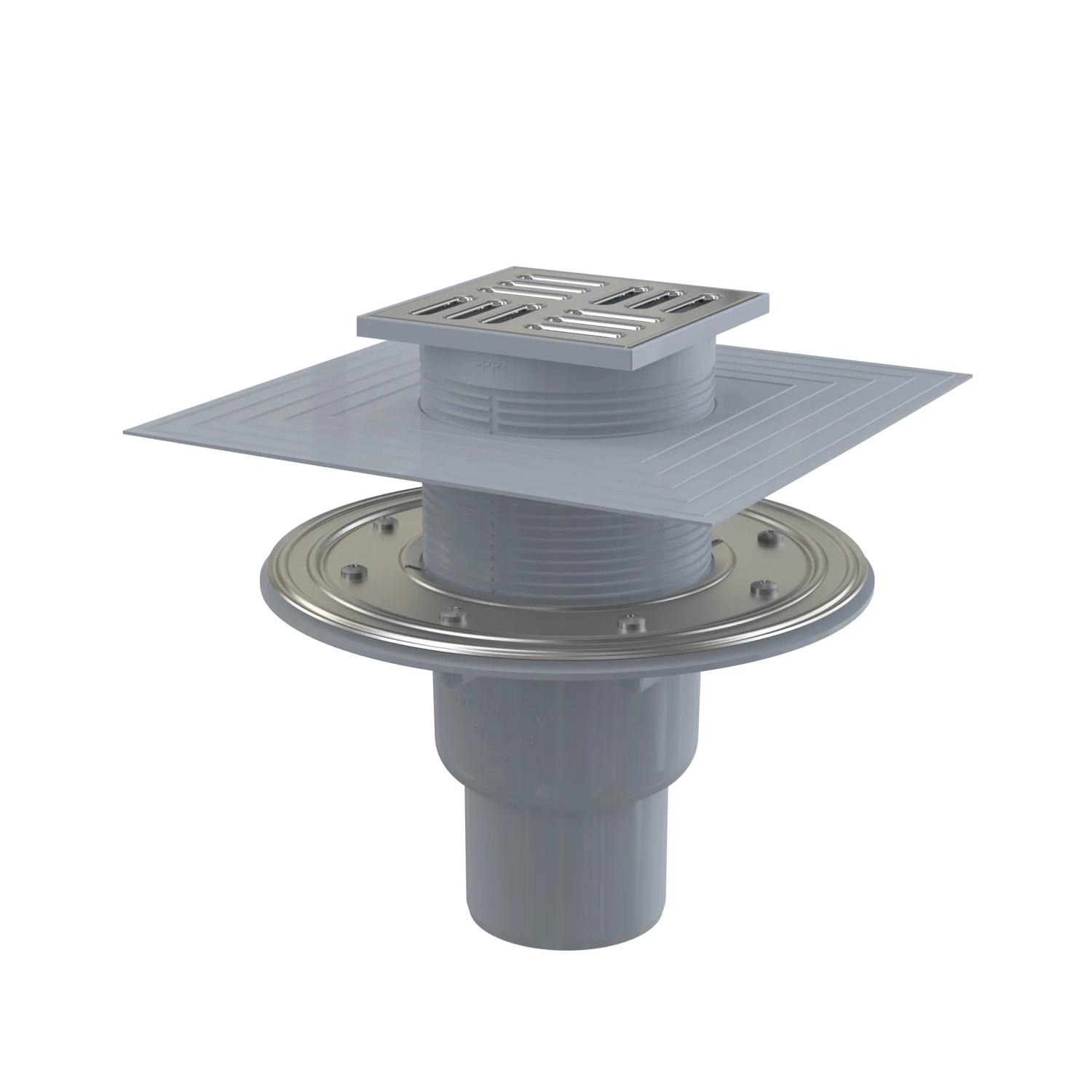 Nerezová mřížka 102x102x5 mm. Výškově upravitelné hrdlo 25-95 mm. Široký izolační límec pro napojení na hydroizolaci stavby. Límec 2. úrovně izolace k napojení hydroizolační vrstvy pod dlažbou. Nerezový límec pro pevné přichycení hydroizolační fólie nebo Ç