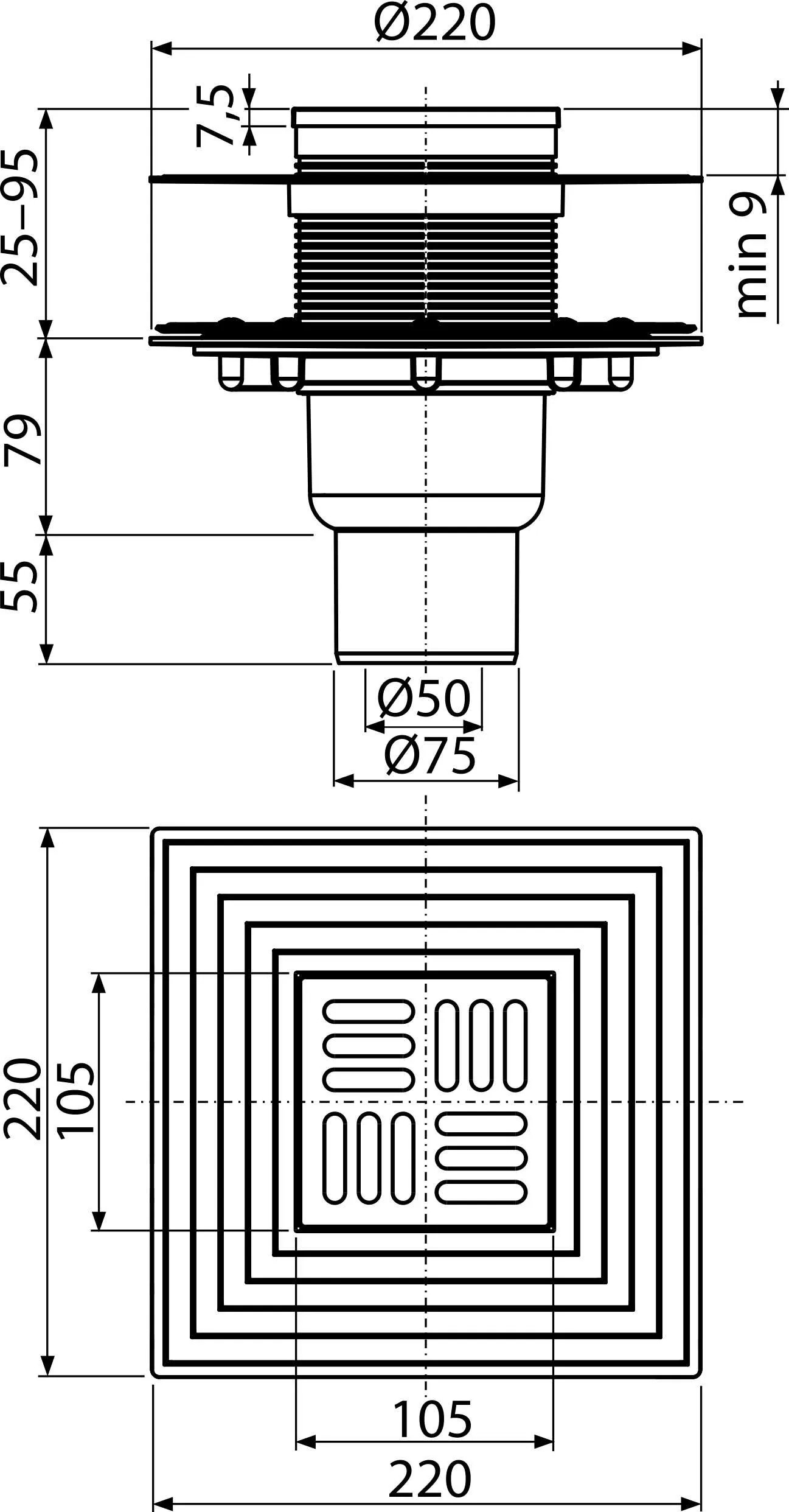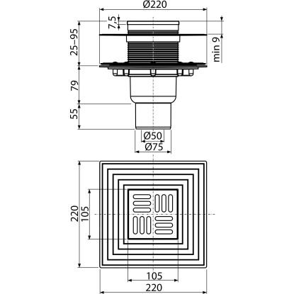 Alcadrain Podlahová vpust 105x105/50/75 mm přímá, mřížka nerez,
