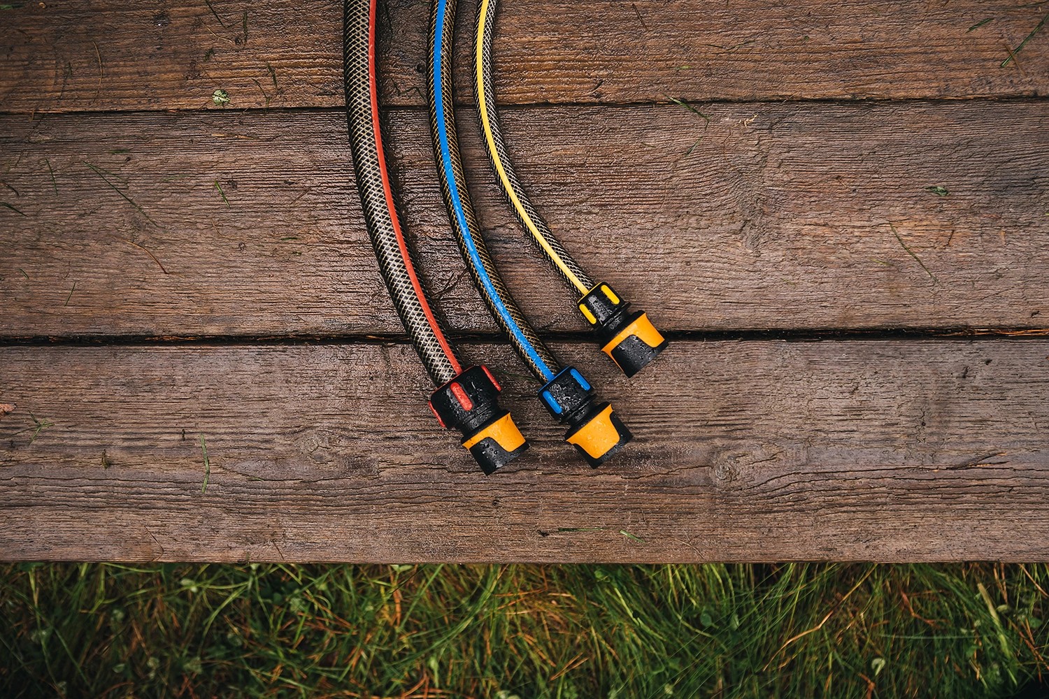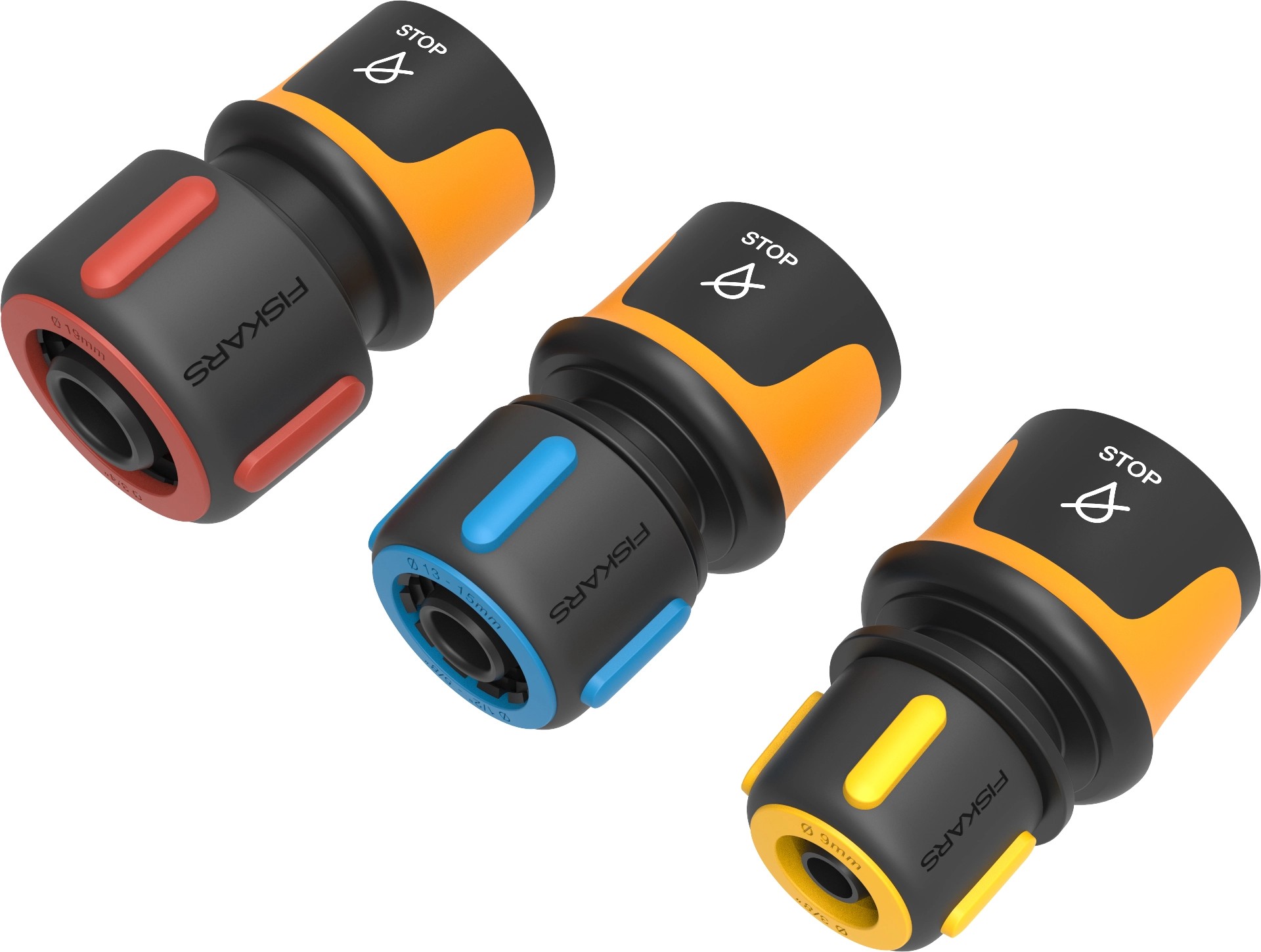 Výběr a přiřazení hadic a přípojek je díky našemu systému barevného kódování jednoduchý: Modrá pro 13 mm - 15 mm (1/2 palce - 5/8 palce), červená pro 19 mm (3/4 palce) a žlutá pro 9 mm (3/8 palce). Všechny spojky Fiskars mají univerzální tvar a lze je použít se zavlažovacími výrobky jiných značek.