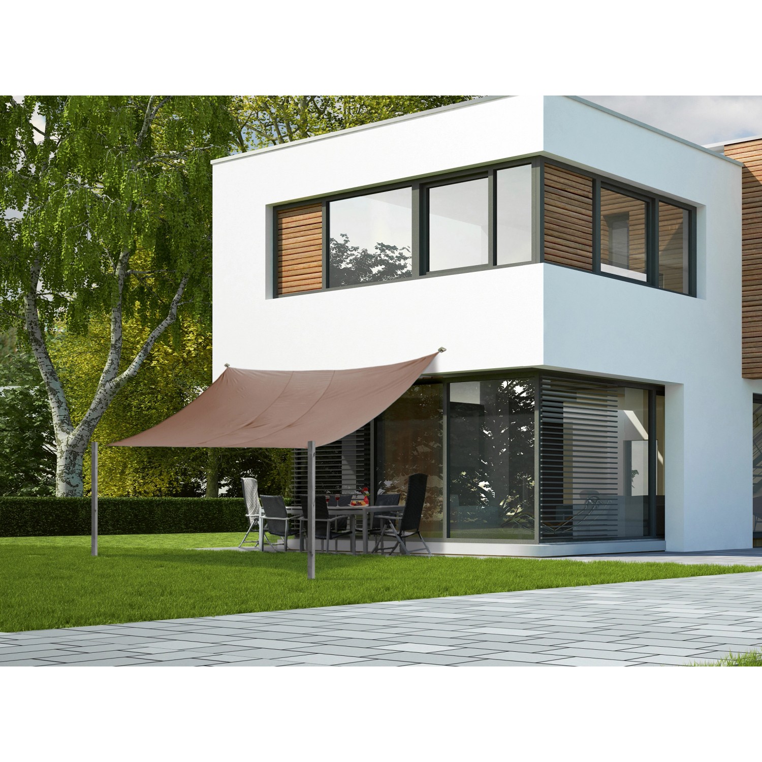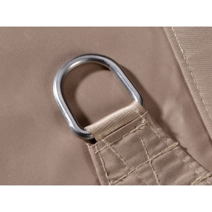 Sluneční plachta je vyrobena z polyesterové tkaniny s gramáží 180 g/m2 odolné vůči UV záření. Použitý materiál chrání proti větru a vodě a navíc je odolný proti roztržení. Celkové rozměry jsou 360 x 360 cm (V x Š). Díky přiloženým upevňovacím expandérům a nerezovým okům připevníte sluneční plachtu snadno a rychle.
