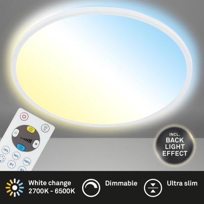 Na rozdíl od ostatních svítidel Briloner Slim je toto svítidlo navíc opatřeno možností nastavení barvy světla v teplotě chromatičnosti 2700-6500 K, je stmívatelné a disponuje efektem podsvícení, který dodává světlu elegantní vzhled a zajišťuje jemné rozptýlení světla po celé místnosti. To vše ovladatelné pomocí dálkového ovladače, který je součástí dodávky.