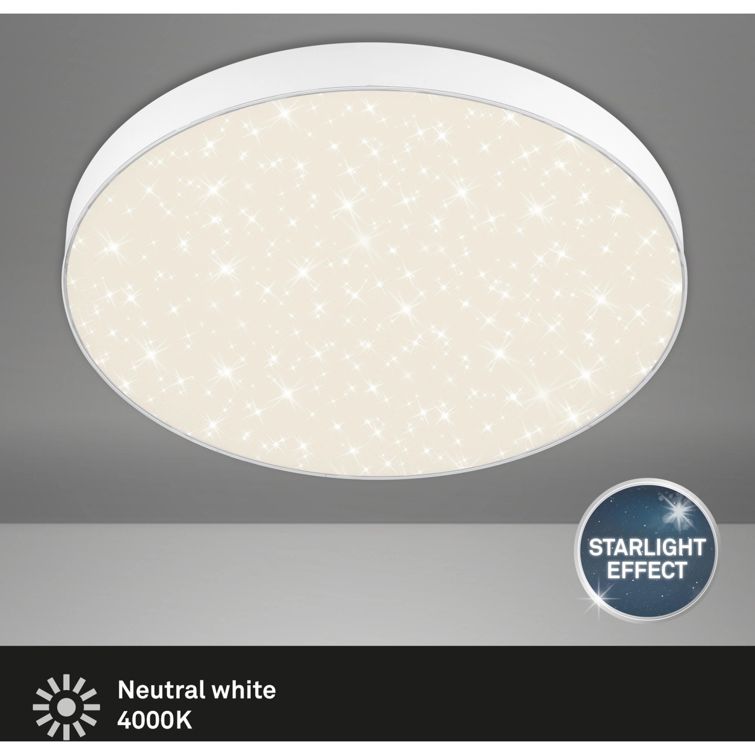 Briloner LED stropní svítidlo ze série Flame Star upoutá pozornost především díky dekoru hvězdné oblohy. Svítidlo obsahuje LED desku s 24,5 W a 2 550 lm. Světlo má příjemně neutrální bílý odstín 4 000 kelvinů, takže se efekt hvězdné oblohy obzvláště hezky vyjímá. Rozměry svítidla jsou 387 x 36 mm (Š x V).