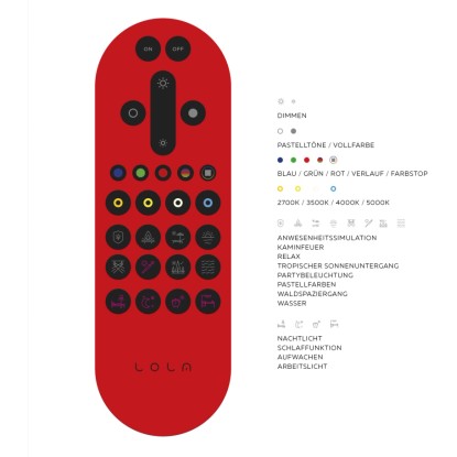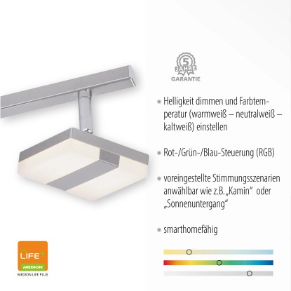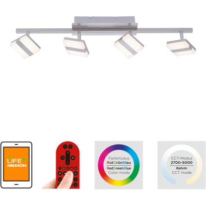 Svítidlo se ovládá přiloženým dálkovým ovládáním LOLA. Infračervené dálkové ovládání LOLA je okamžitě připraveno k použití. Můžete si vybrat ze dvanácti naprogramovaných světelných scénářů nebo si vyberte barvu z RGB barevného režimu. Sami si určete, v jaké světelné atmosféře se budete cítit příjemně, nebo přizpůsobte světlo vaší náladě. Svítidlo je kompatibilní také se systémem Smarthome a má tak ještě větší využití. Pomocí aplikace MEDION LIFE+ můžete všechny funkce ovládat také prostřednictvím tabletu, smartphonu nebo hlasovým příkazem pomocí hlasového asistenta, např. Amazon Alexa nebo Google Home.