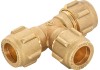 Tři stejné přípojky jsou vždy opatřeny šroubením se svěracím kroužkem o průměru 12 mm. Těsný svěrací kroužek a převlečná matice zajišťují spolehlivé a těsnící upevnění. T-kus je vyroben z robustní mosazi s dlouhou životností. Při montáži se nasune konec trubky a poté se utáhne převlečná matice. Použití je povoleno pro instalace pitné vody.