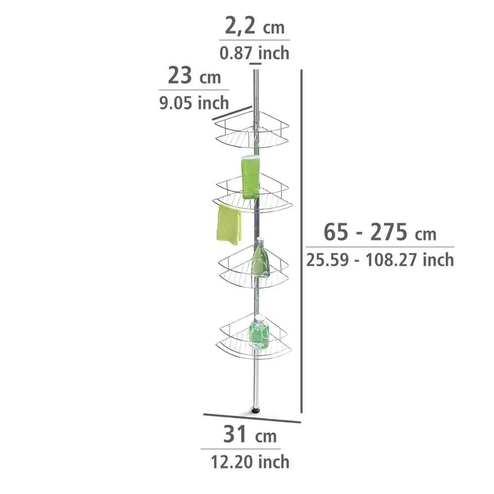 Teleskopický regál Wenko Dolcedo je určen pro použití v rozích sprchových koutů, van a koupelen. Praktická stojan se čtyřmi drátěnými košíky z nerezové oceli nabízí spoustu místa pro uložení šamponu, sprchového gelu, mýdla, mycích hub a dalších sprchových potřeb. Dva koše mají přídavný držák na zavěšení žínek atd. Montáž je rychlá, snadná a bez vrtání - teleskopická tyč se jednoduše upne mezi podlahu a strop. Teleskopická tyč s průměrem trubky 22 mm je nastavitelná v rozmezí 65-275 cm.