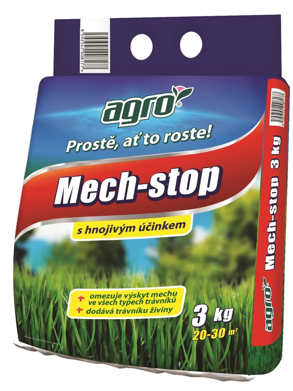Agro Mech-stop je velmi účinné dusíkaté hnojivo s vysokým obsahem železa, které má vliv na omezení mechu v trávníku. Působením hnojiva proti mechu dochází k zaschnutí mechového porostu v trávníku. Následně mech snadno odstraníte z travního porostu. Obsažená hnojiva s dusíkem a železem způsobují syté zabarvení trávníku a jeho rychlejší regeneraci. Holá místa jsou po odstranění mechu rychle zapojena do základního porostu.