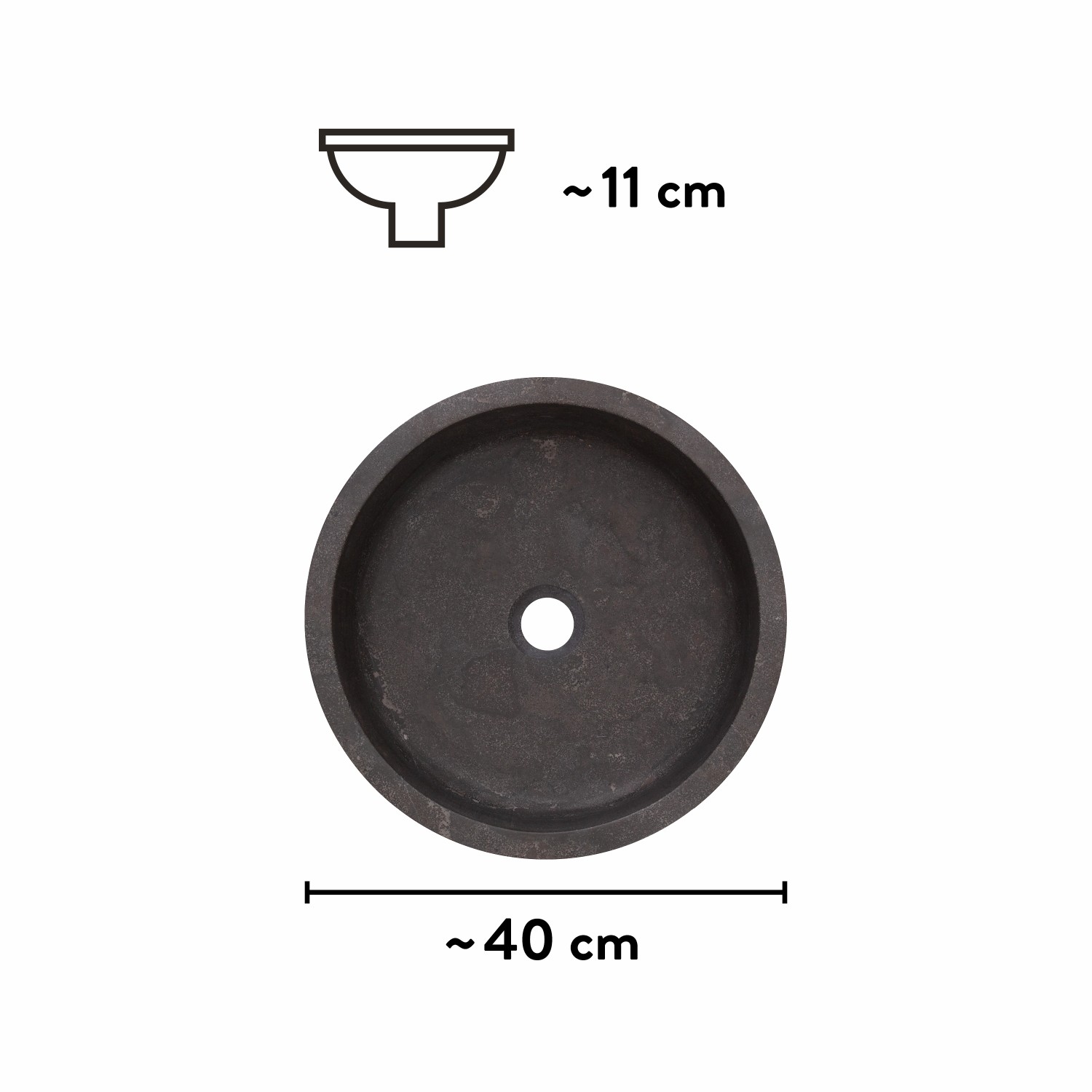Díky kompaktním rozměrům, tzn. průměru 40 cm a výšce 11 cm, lze umyvadlo na desku bez problémů umístit také do malých koupelen nebo na WC pro hosty. Umyvadlo lze připevnit na stabilní desku, umyvadlové skříňky nebo spodní skříňky vhodné velikosti. Masivní umyvadlo nemá otvor na baterii a přepad. Takže vypadá, "jako by ho tvořil jeden kus". Můžete ho doplnit nástěnnou baterií nebo baterií s vysokým výtokovým ramínkem, kterou připevníte vedle umyvadla. Obzvláště důležité: Umyvadlo bez přepadu lze používat pouze s neuzavíratelným ventilem. Díky tomu nemůže voda nikdy přetéci.