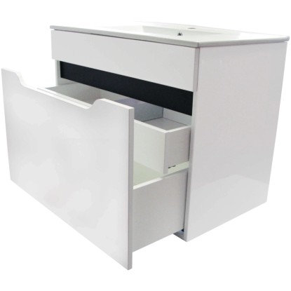 Koupelnová skříňka s keramickým umyvadlem Lucas 80. 2 zásuvky SoftClose. V horní zásuvce je výřez pro sifon. Skříňka je určena k zavěšení na stěnu. Korpus: LTD 16 mm bílý lak - lesk, čela zásuvek MDF 16 mm bílý lak - lesk. V balení vyměnitelné dekorativní lišty: černá a dub.