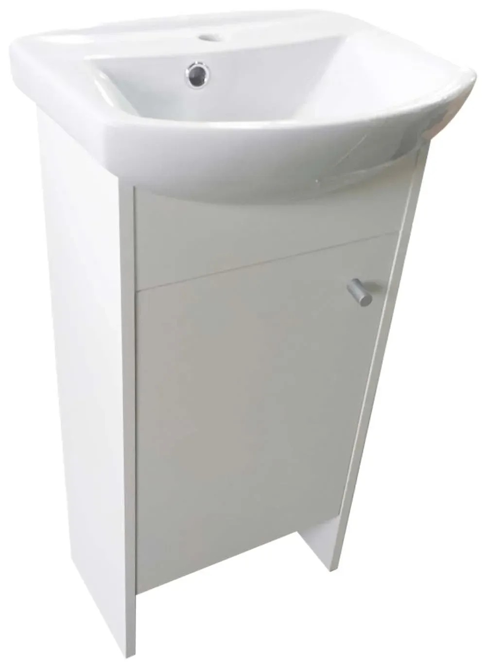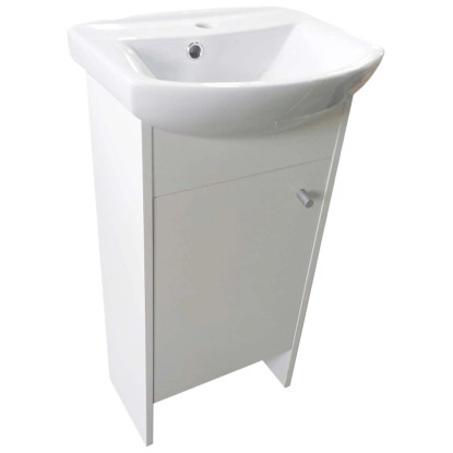 Koupelnová skříňka vyrobena z dřevotřískové desky s melaminovou povrchovou úpravou proti navlhnutí je dodávána včetně keramického umyvadla o velikosti 45 cm. Skříňka je k dispozici pouze v bílé barvě.