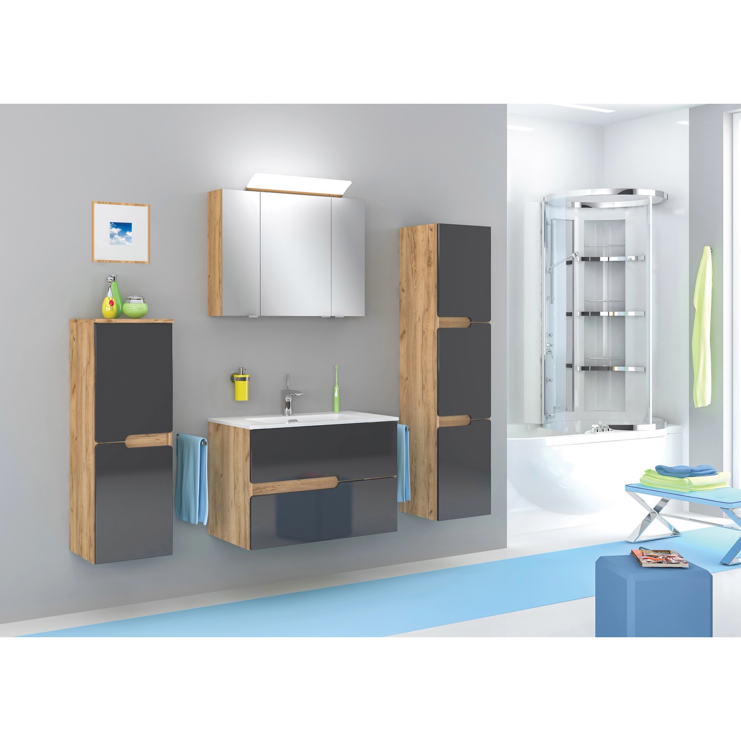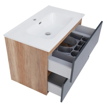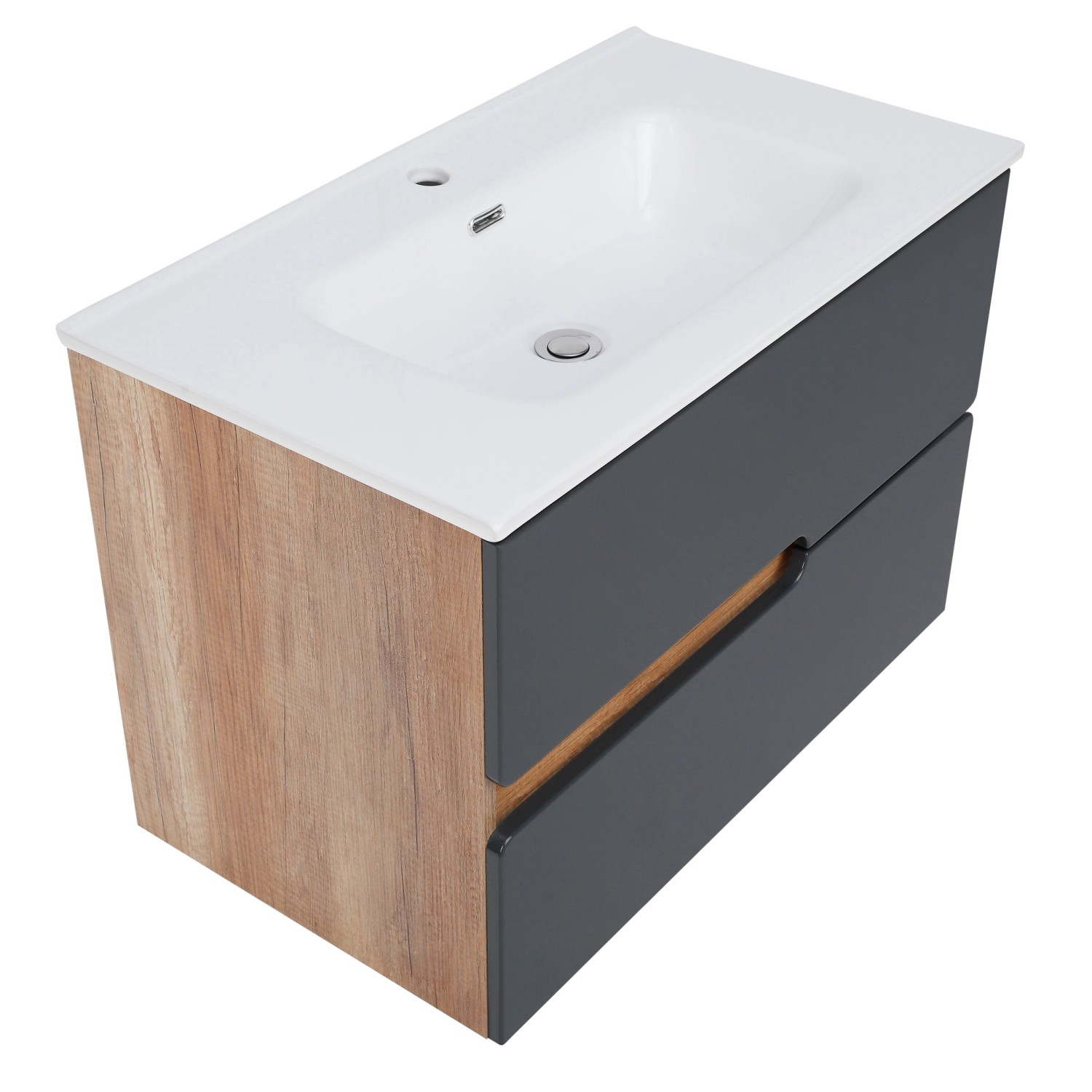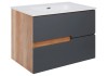Koupelnová skříňka s keramickým umyvadlem. Skříňka se dvěma zásuvkami s tichým dovíráním SoftClose je doplněna praktickým plastovým organizérem, umístěným v horní zásuvce. Korpus skříňky je vyroben z lamina v dekoru Dub Country, čela zásuvek jsou z MDF desky s povrchovou úpravou lesklou fólií v barvě antracit. Skříňka je doplněna keramickým umyvadlem s přepadem a otvorem pro montáž vodovodní baterie. K zavěšení skříňky na stěnu slouží rektifikační závěsy.