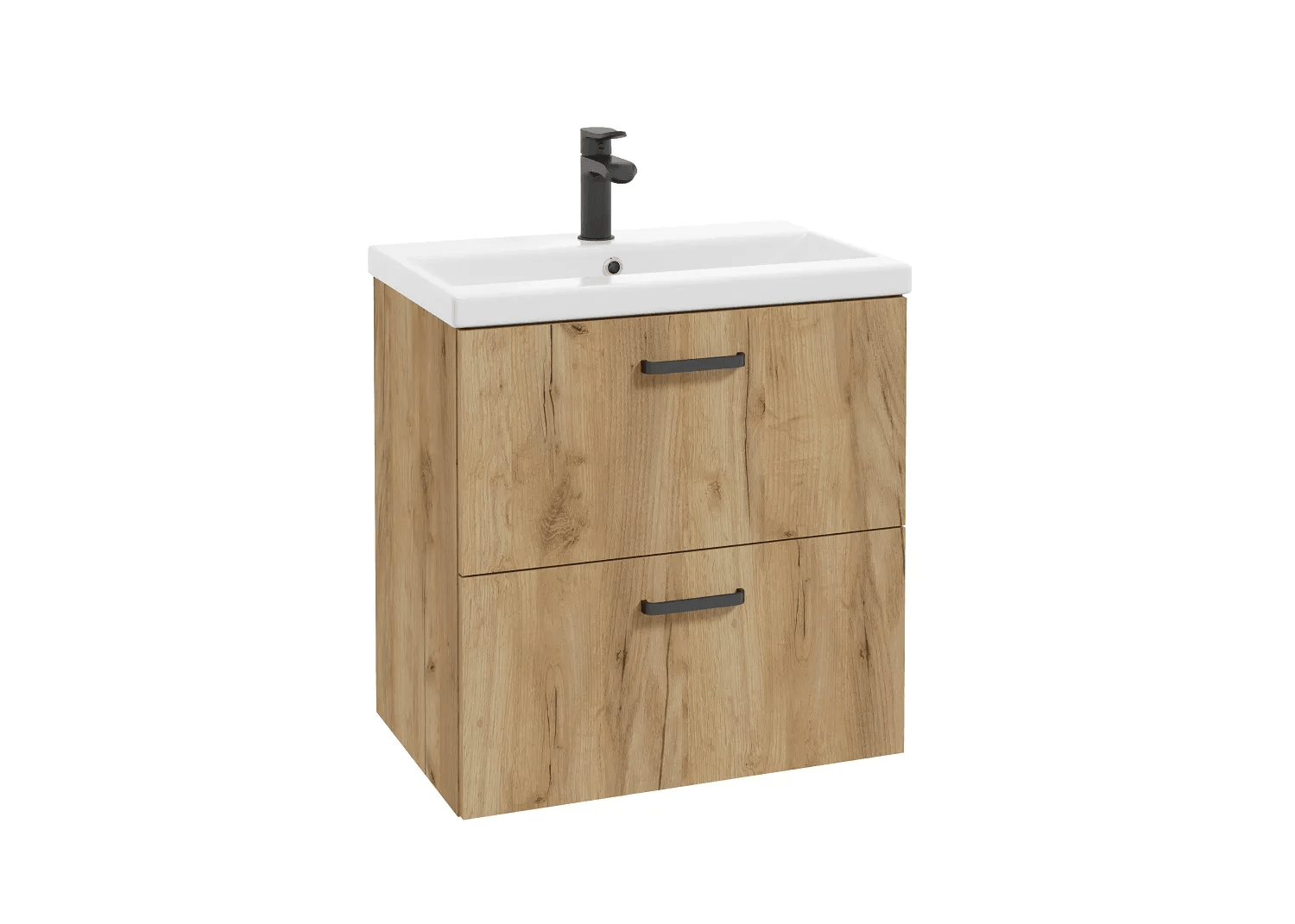 Ušetřete čas a starosti se sadou umyvadla se skříňkou Deftrans Gaja D60. Závěsná skříňka je vyrobena z kvalitní laminované dřevotřískové desky (LTD) s dekorem zlatého dubu (čelo i korpus). Koupelnový nábytek v dřevěném vzhledu dodá každé koupelně eleganci a hřejivou atmosféru. Skříňka je opatřena dvěma prostornými zásuvkami se systémem tichého dovírání Soft-Close a kovovými úchytkami v matné černé barvě, které dodají skříňce eleganci. Kvalitní keramické umyvadlo má přepad a otvor na baterii.