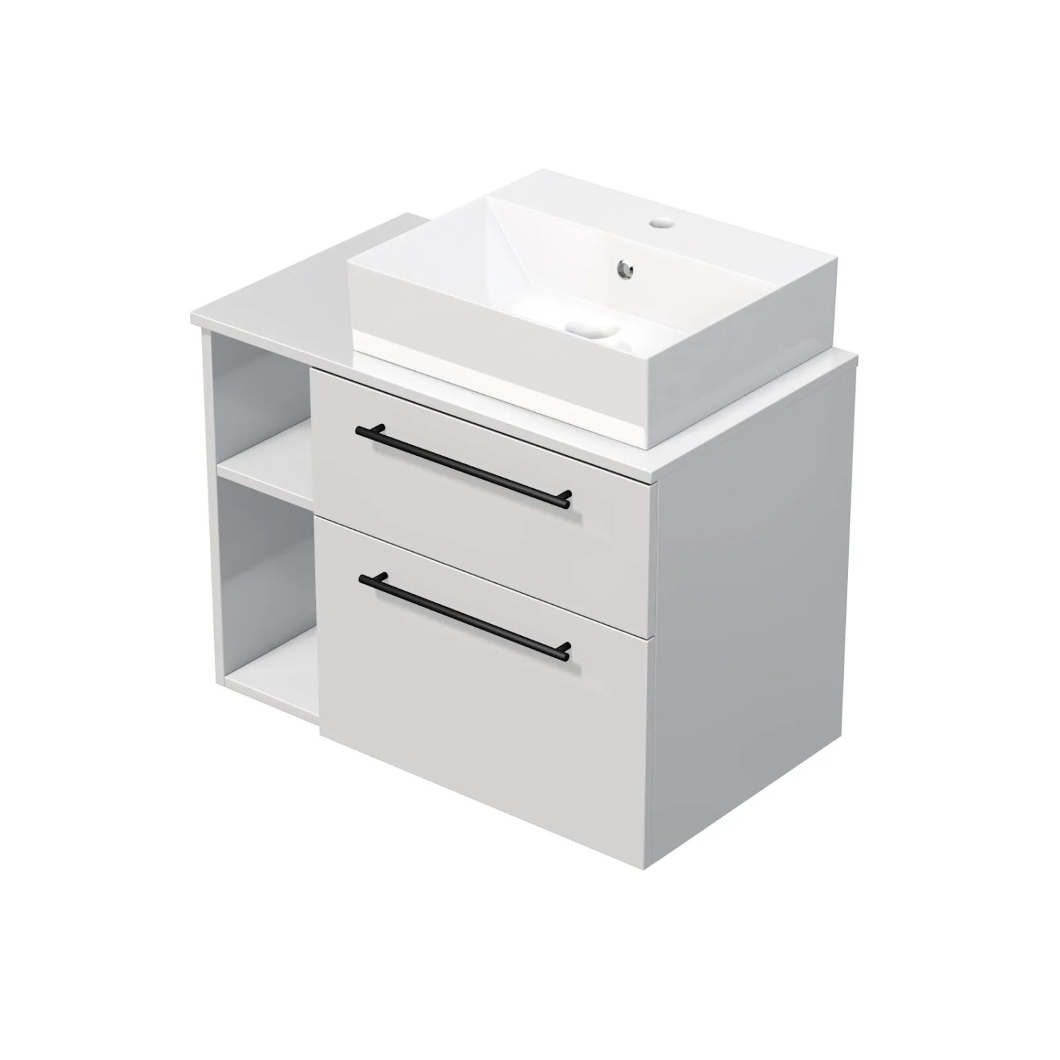 - Součást balení: skříň (včetně instalačního balíčku), keramické umyvadlo na desku, černé matné úchytky (včetně šroubků), instalační manuál