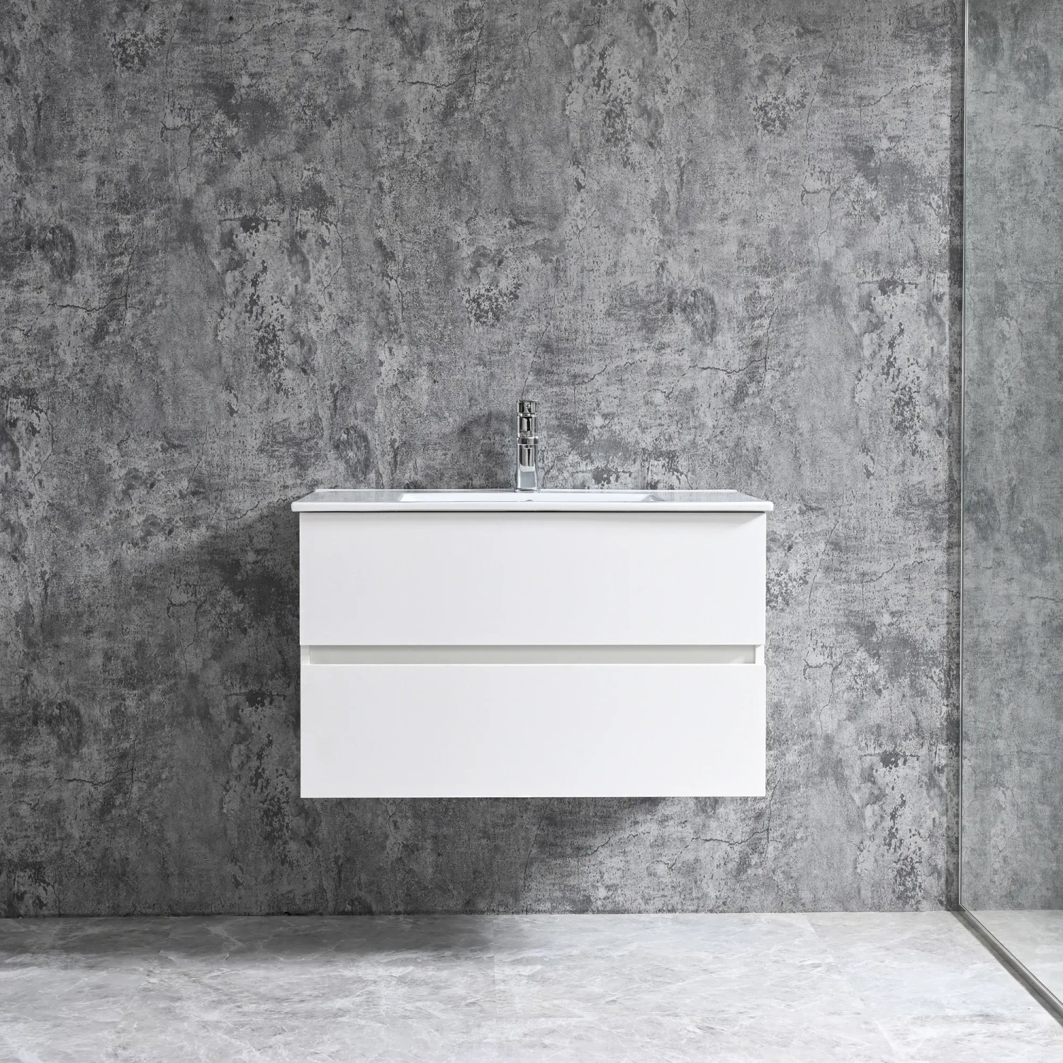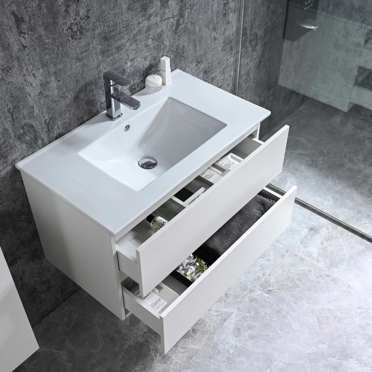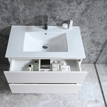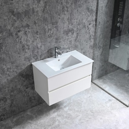 Umyvadlová skříňka Sanotechnik ze série Corbo je k dispozici ve třech dekorech (bílá, javor a stříbrný dub) a několika různých šířkách. Skříňka je vybavena dvěma prostornými zásuvkami s tichým zavíráním Soft-Close a integrovanými úchytkami a je doplněna vestavěným keramickým umyvadlem. Korpus i čela skříňky jsou vyrobena z MDF desky tloušťky 15 mm potažené melaminovou fólií.