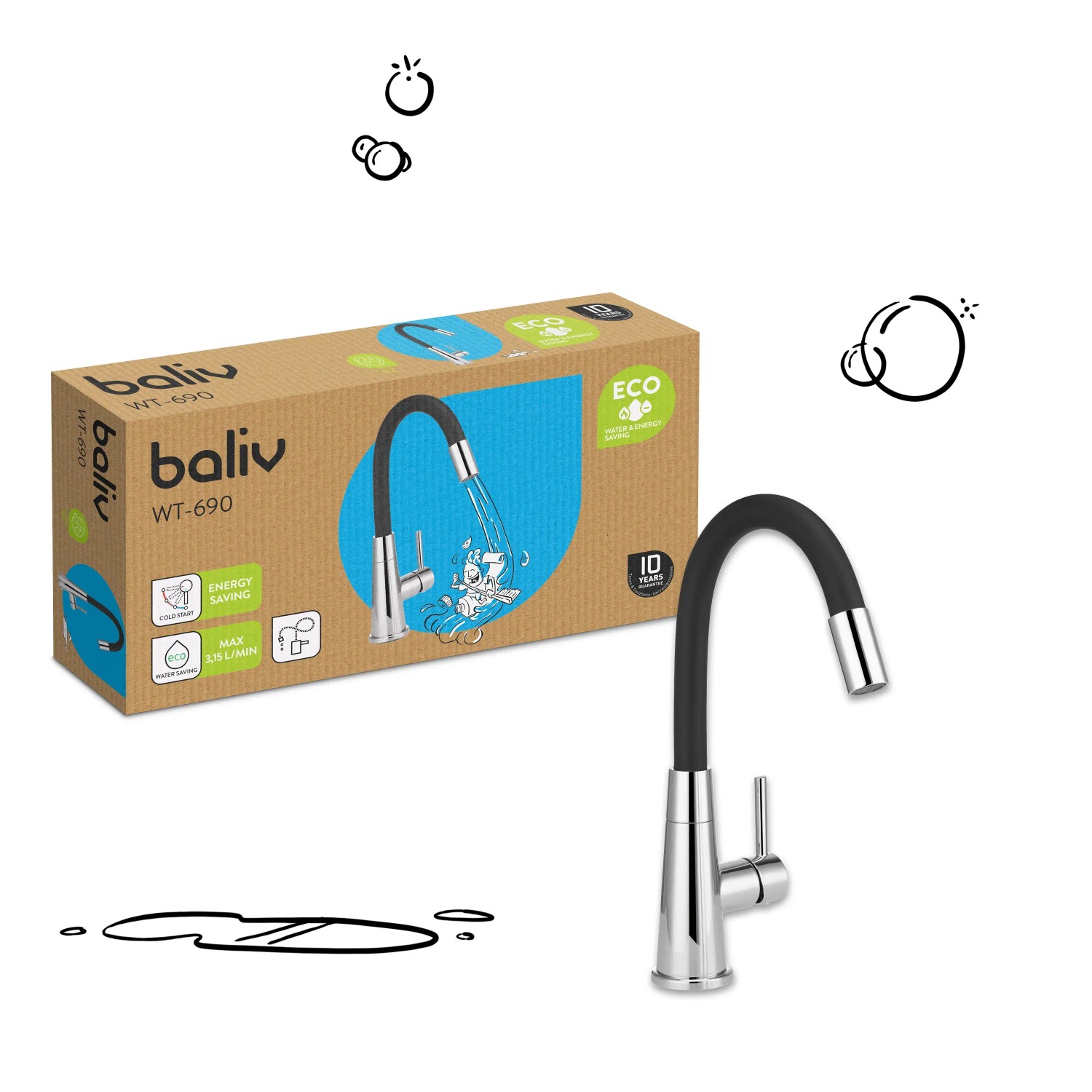 Umyvadlová páková baterie baliv WT-690Tato umyvadlová stojánková páková baterie je díky svému univerzálním a elegantnímu vzhledu vhodná do každé koupelny. Díky funkci studeného startu a maximálnímu průtoku 3,15 l/min při tlaku 3 bar pomáhá baterie šetřit vodu a energii. Díky praktickému flexi ramenu můžete jednoduše očistit i rozměrná umyvadla.