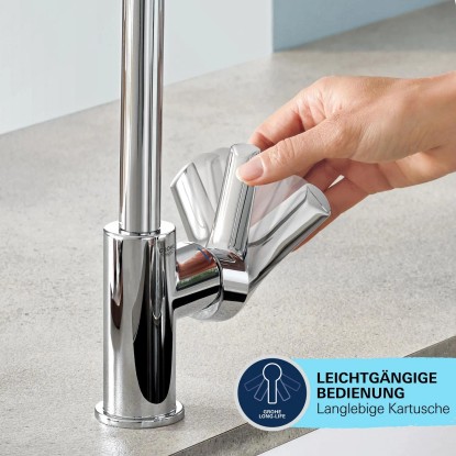 Keramická kartuše GROHE Long-Life uvnitř nabízí odolné a přesné ovládání objemu a teploty pomocí masivní kovové páky. Integrovaný omezovač teploty šetří energii, zatímco technologie GROHE Water Saving technology snižuje spotřebu vody až o 50 %, aniž by to bylo na úkor výkonu. Tato koupelnová baterie s oslnivou, ale odolnou povrchovou úpravou GROHE Long-Life Shine bude vypadat bezchybně po celý život. S nástroji GROHE QuickTool, QuickGuide a QuickVideo prostřednictvím QR kódu lze baterii namontovat během chvilky.