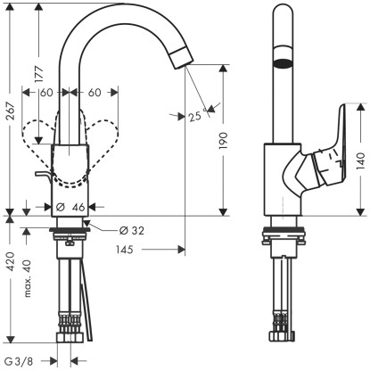 - poloha rukojeti na straně: spodní strana u základního tělesa (nevhodné pro umyvadla)