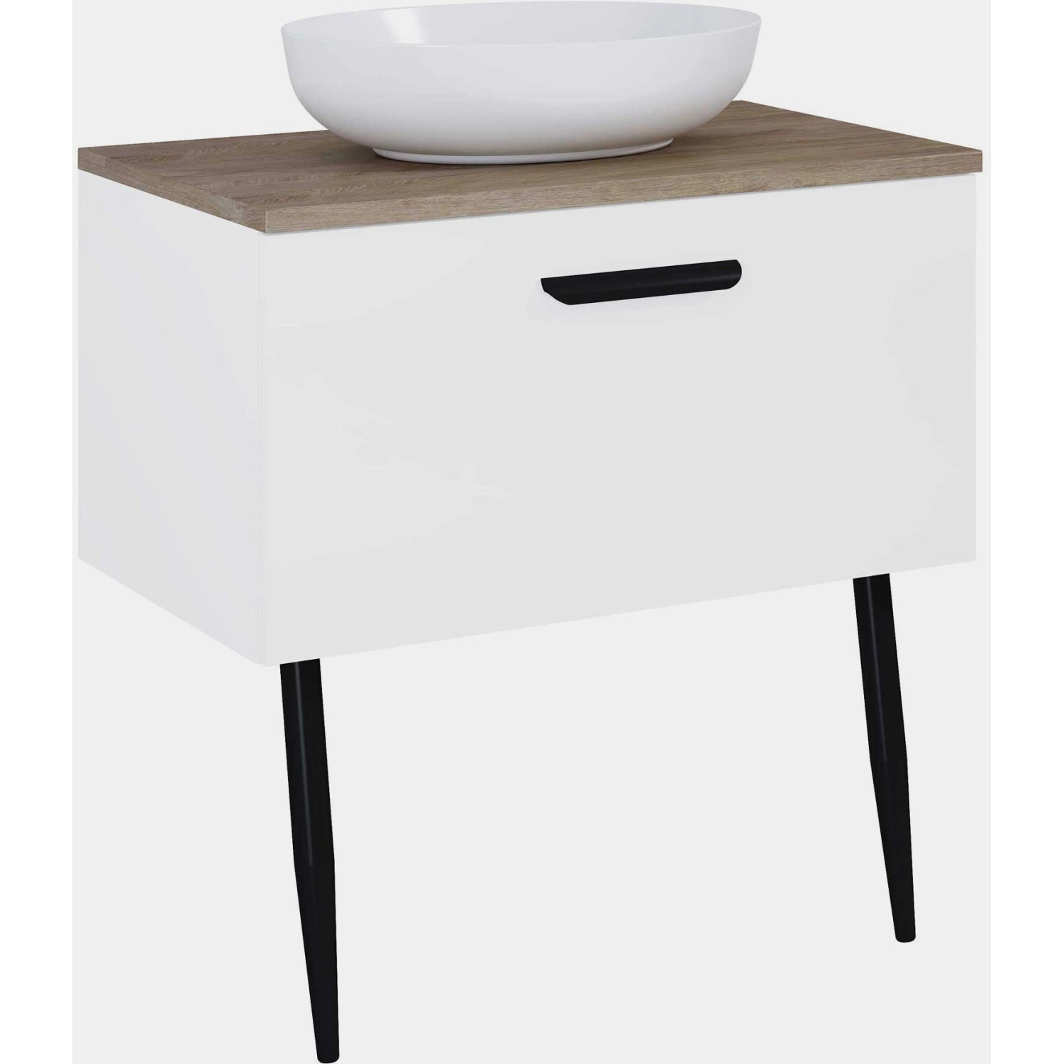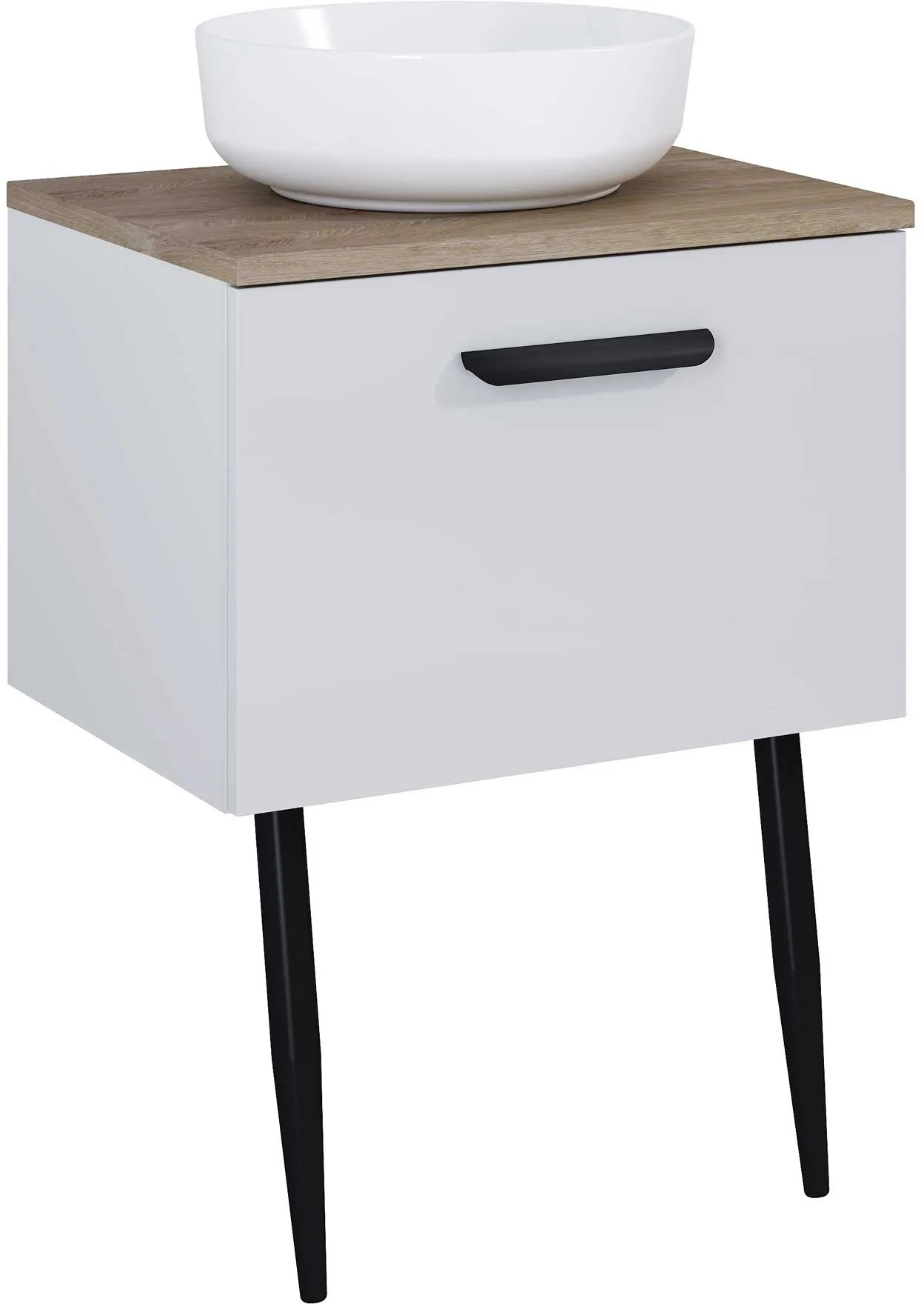 Koupelnové skříňky jsou vyrobeny z kvalitních materiálů - korpus z laminované desky, čelo z MDF desky doplněné černými kovovými úchytkami. Povrch skříněk potažen melaminem je odolný vůči vlhkosti a snadno se čistí. Praktickým detailem je zavírání SoftClose, díky kterému se zásuvky a dvířka zavřou jemně a tiše.