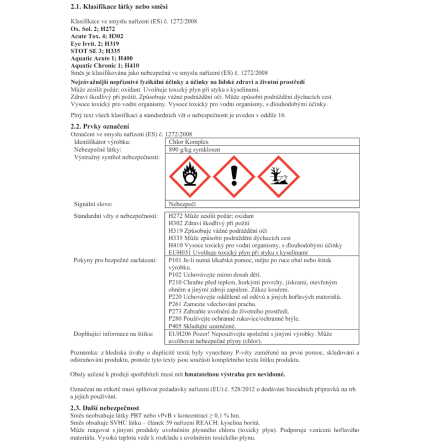 Dvouvrstvé modrobílé tablety s tmavšími částicemi o hmotnost 200 g pomalu rozpustné ve vodě. Účinnou látkou je symklosen (kyselina trichlorisokyanurová) 890 g/kg, indexové číslo 613-031-00-5.