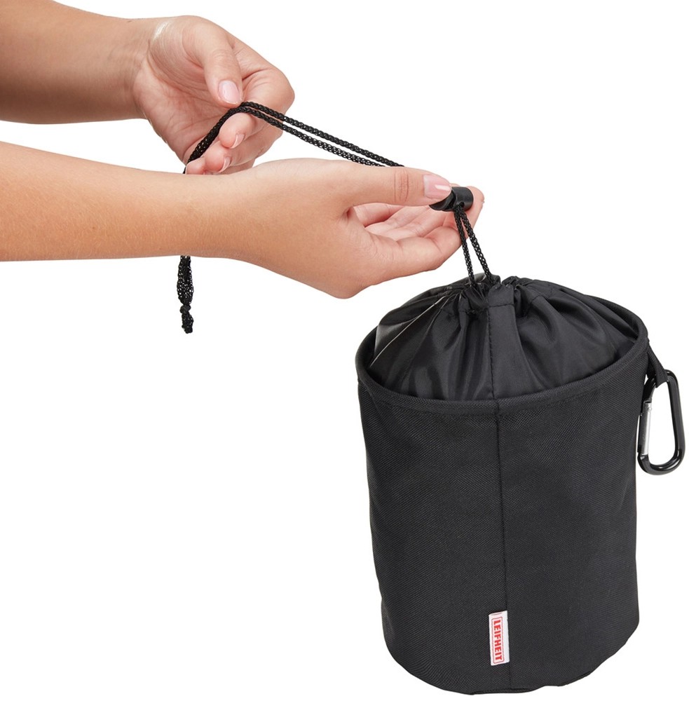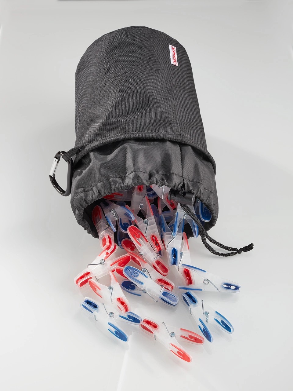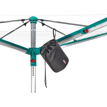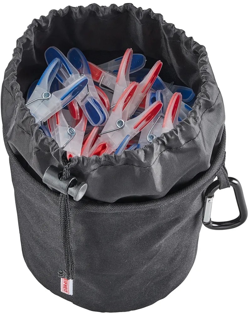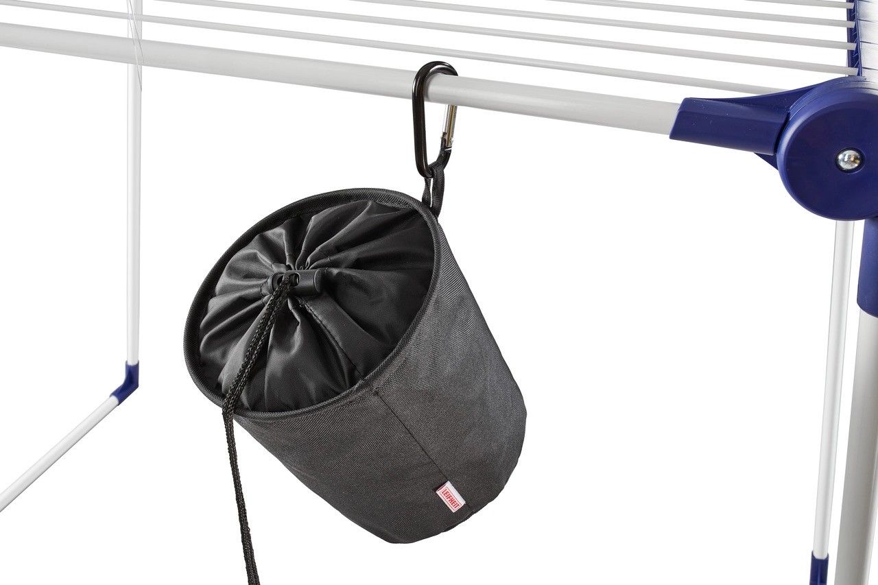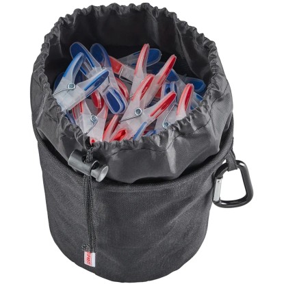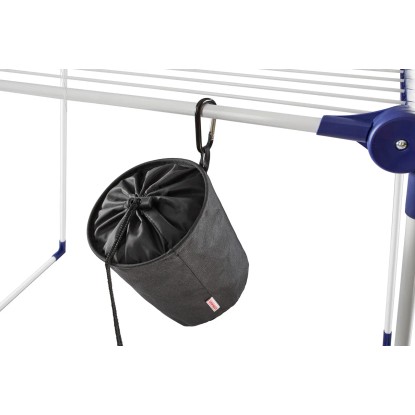 Praktický koš s kapacitou až pro 100 kolíčků na prádlo, z vysoce kvalitní voděodolné látky, chrání před pronikáním vlhkosti, praktický háček na zavěšení, uzavirání pomocí šňůrky.