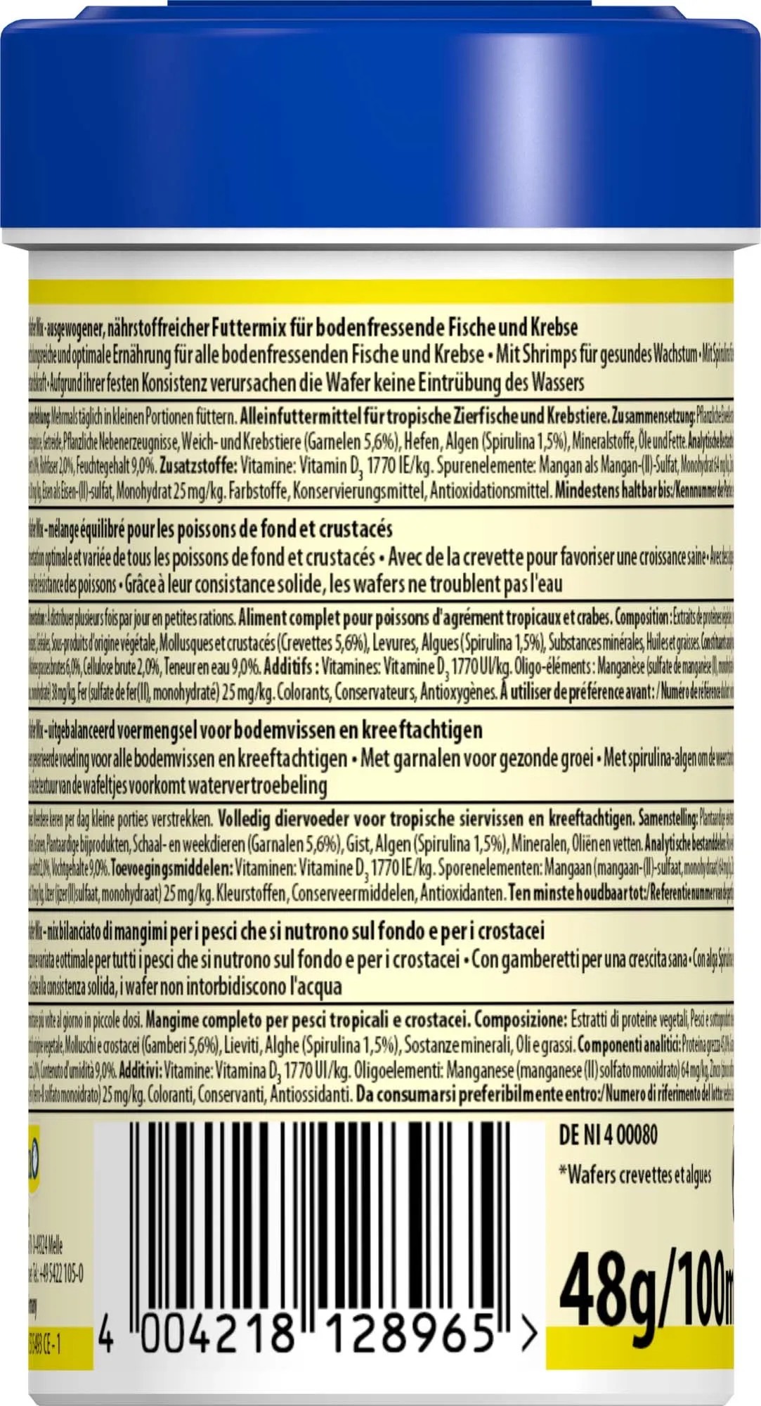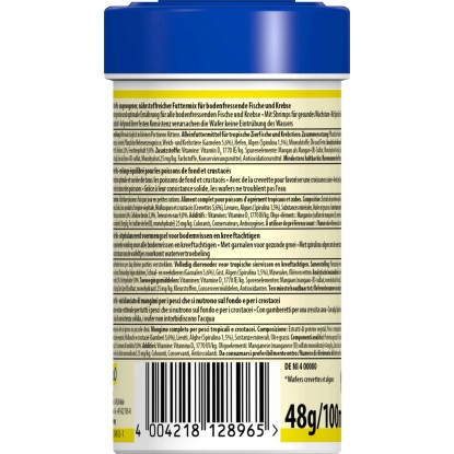 Kompletní krmivo pro tropické okrasné ryby a korýše. Zelené tablety jsou s vysokým obsahem řasy spiruliny, která je nejlepší potravou pro býložravce, žijící u dna. Hnědé jsou nejvhodnější pro masožravce. Tablety mají přesně vyvážené složení, takže se ve vodě pozvolna rozpouští. Tyto ryby a krevety si obvykle svou potravu šetří, takže toto krmení plně odpovídá jejich požadavkům.