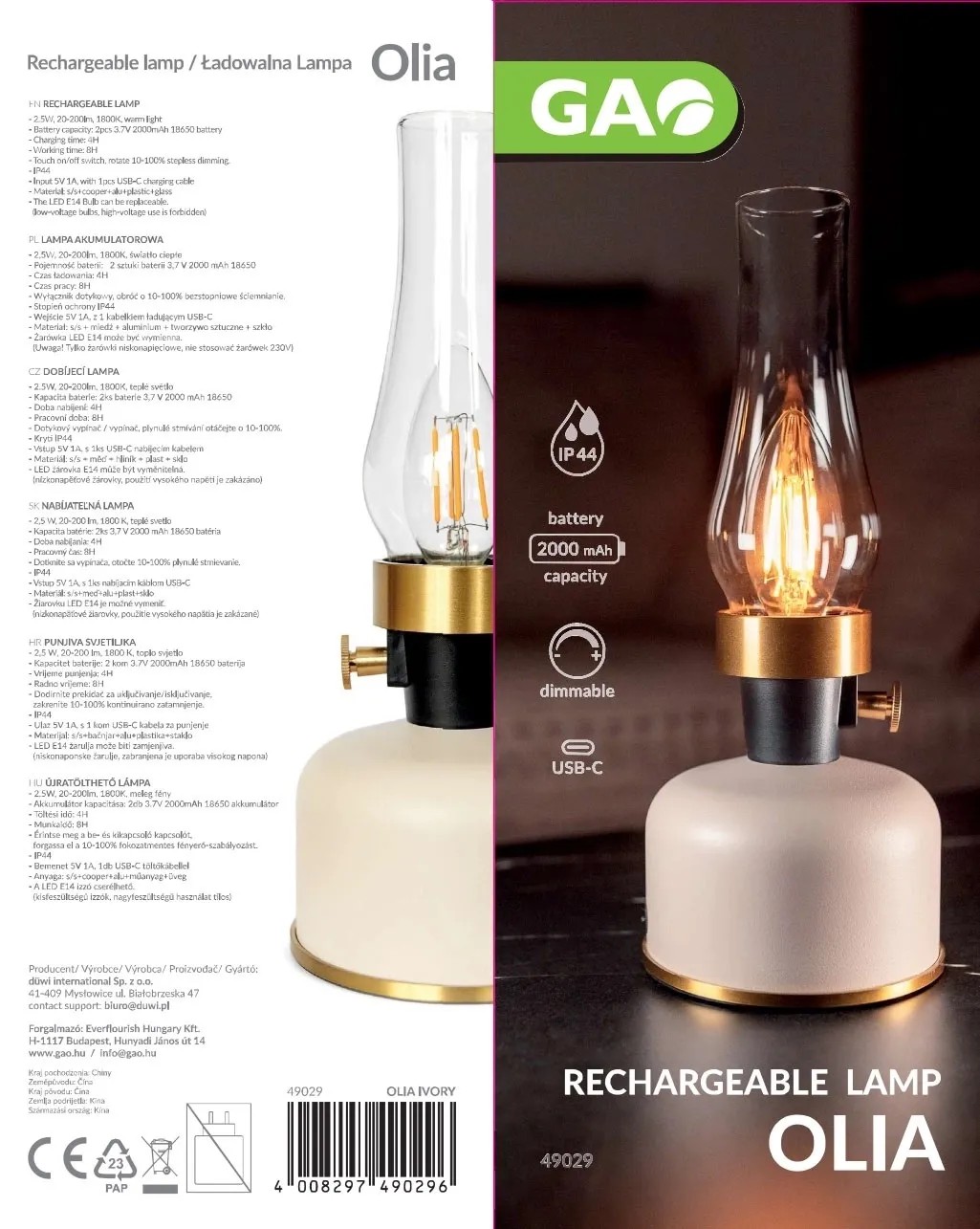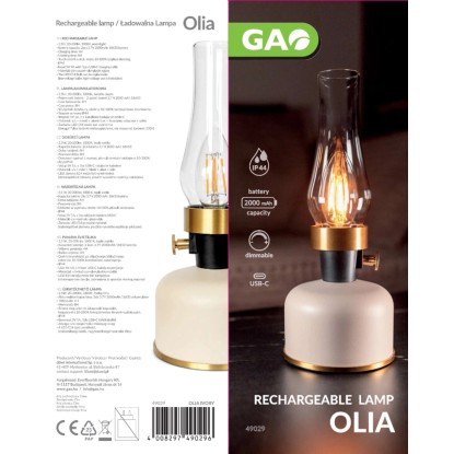 Tato dobíjecí stolní lampa GAO OLIA svým designem vypadá jako klasická petrolejová lampa, ale přináší hned několik výhod. Její klasický design vytváří příjemnou a romantickou atmosféru. Lampa OLIA je vybavena žárovkou s paticí E14, která je vyměnitelná. Jako náhrada jsou vhodné nízkonapěťové žárovky s paticí E14. Použití vysokonapěťových žárovek 230 V je zakázáno.