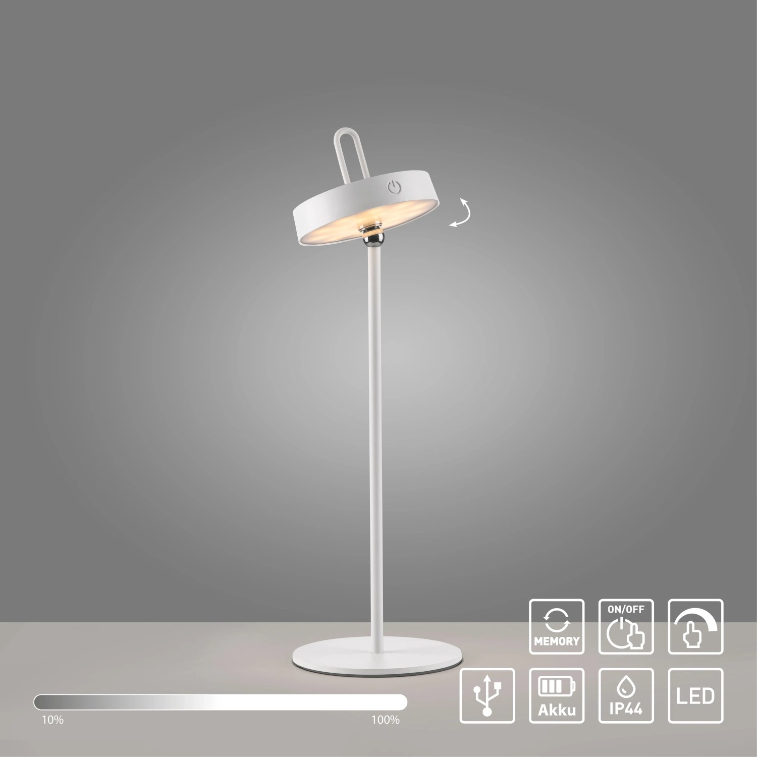 Teplá bílá barva světla 2700 K zajišťuje příjemnou světelnou atmosféru. Díky funkci paměti zůstanou všechna zvolená nastavení uložena, dokud neprovedete změnu. Zažijte osvětlení novým způsobem s LED bateriovou stolní lampou, flexibilní, praktická a vždy v souladu s vašimi požadavky!