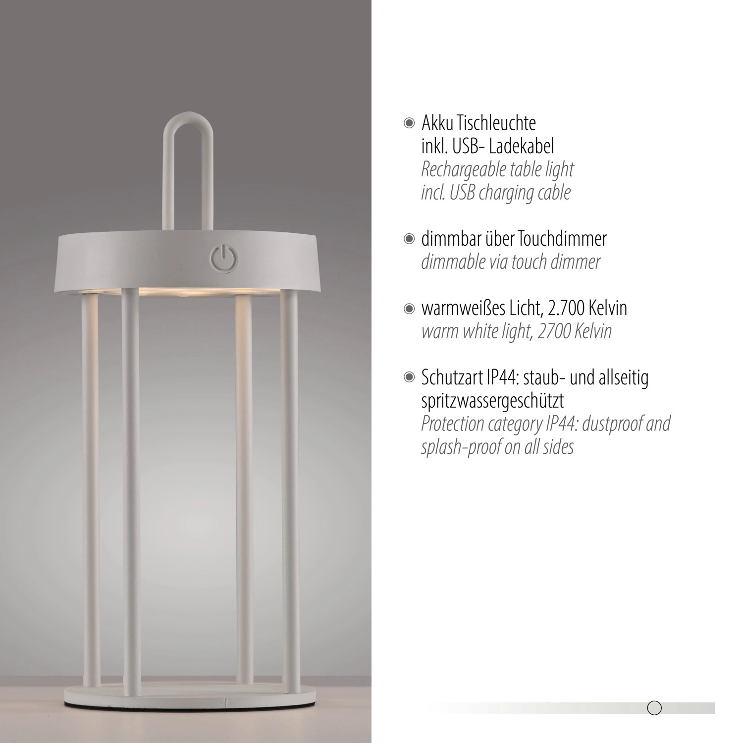 S nabíjecí LED stolní lampou Anselm určujete flexibilní a mobilní trendy. Díky krytí IP44 je stolní lampa vhodná pro použití v interiéru i exteriéru a rychle si najde dekorativní místo kolem domu a zahrady. Svítidlo vyzařuje příjemné, světlo teplé bílé barvy po dobu až 7 hodin. Lampu lze plně nabít do 4 hodin po použití pomocí USB kabelu, který je součástí dodávky.