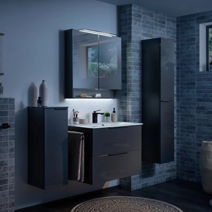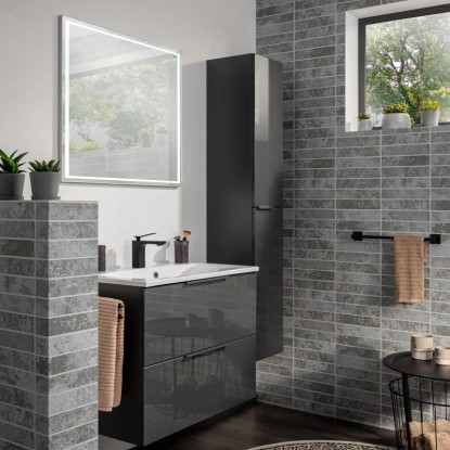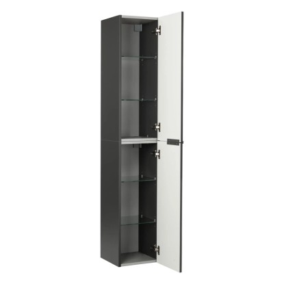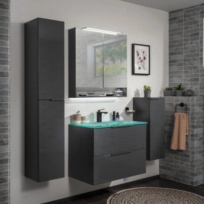 Série koupelnového nábytku FACKELMANN LUNA zaujme svým elegantním antracitovým vzhledem ve vysokém lesku, který zapadne do každé koupelny. Korpusy skříněk mají matný antracitový vzhled, příčky a zadní stěny mají stříbrnošedou barvu. Veškerý koupelnový nábytek LUNA lze jednoduše kombinovat dle libosti.