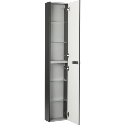 Série koupelnového nábytku FACKELMANN LUNA zaujme svým elegantním antracitovým vzhledem ve vysokém lesku, který zapadne do každé koupelny. Korpusy skříněk mají matný antracitový vzhled, příčky a zadní stěny mají stříbrnošedou barvu. Veškerý koupelnový nábytek LUNA lze jednoduše kombinovat dle libosti.