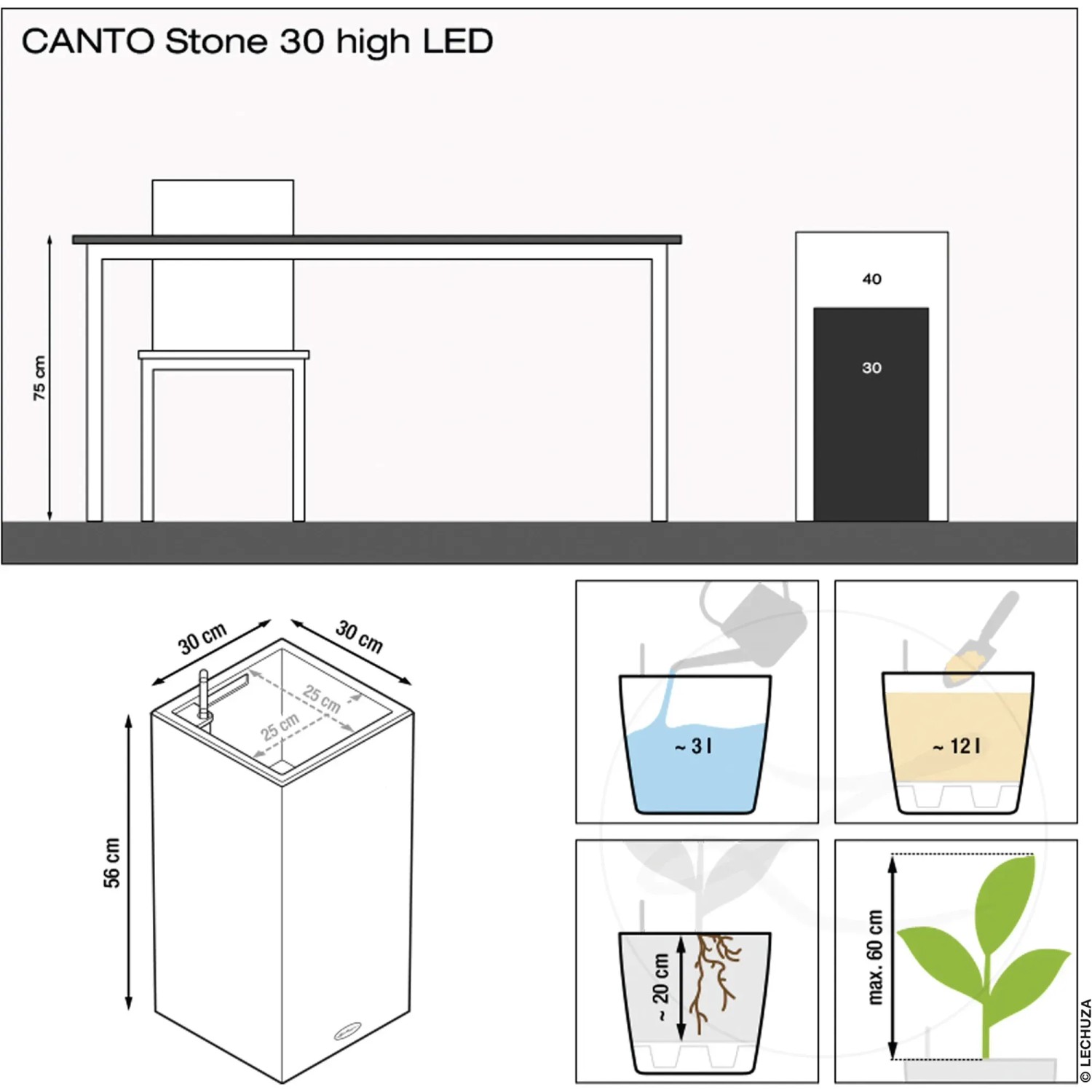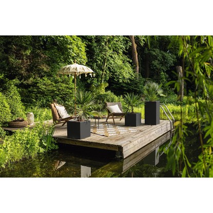 Lechuza Květináč Canto Stone 30 High LED, grafitově černá, 30 x 30 x 56 cm