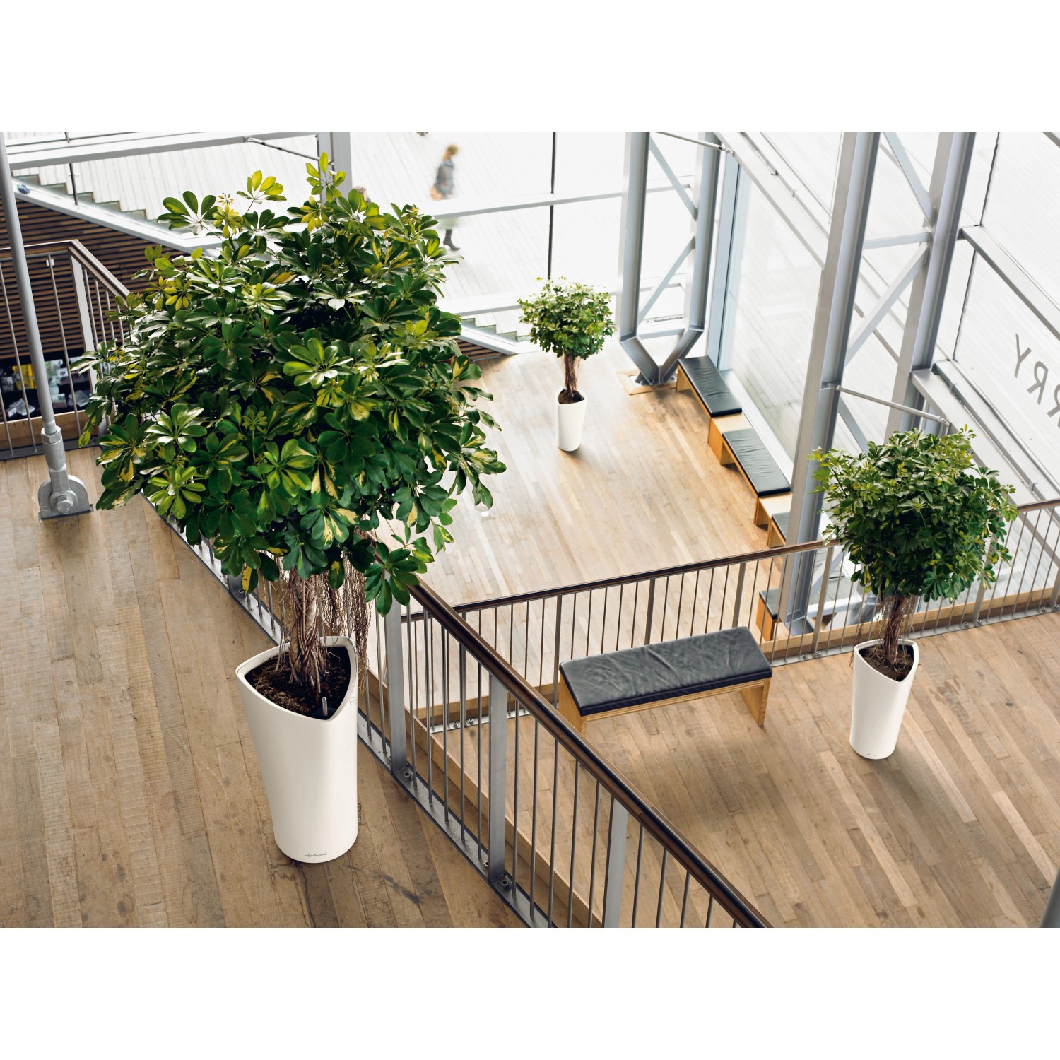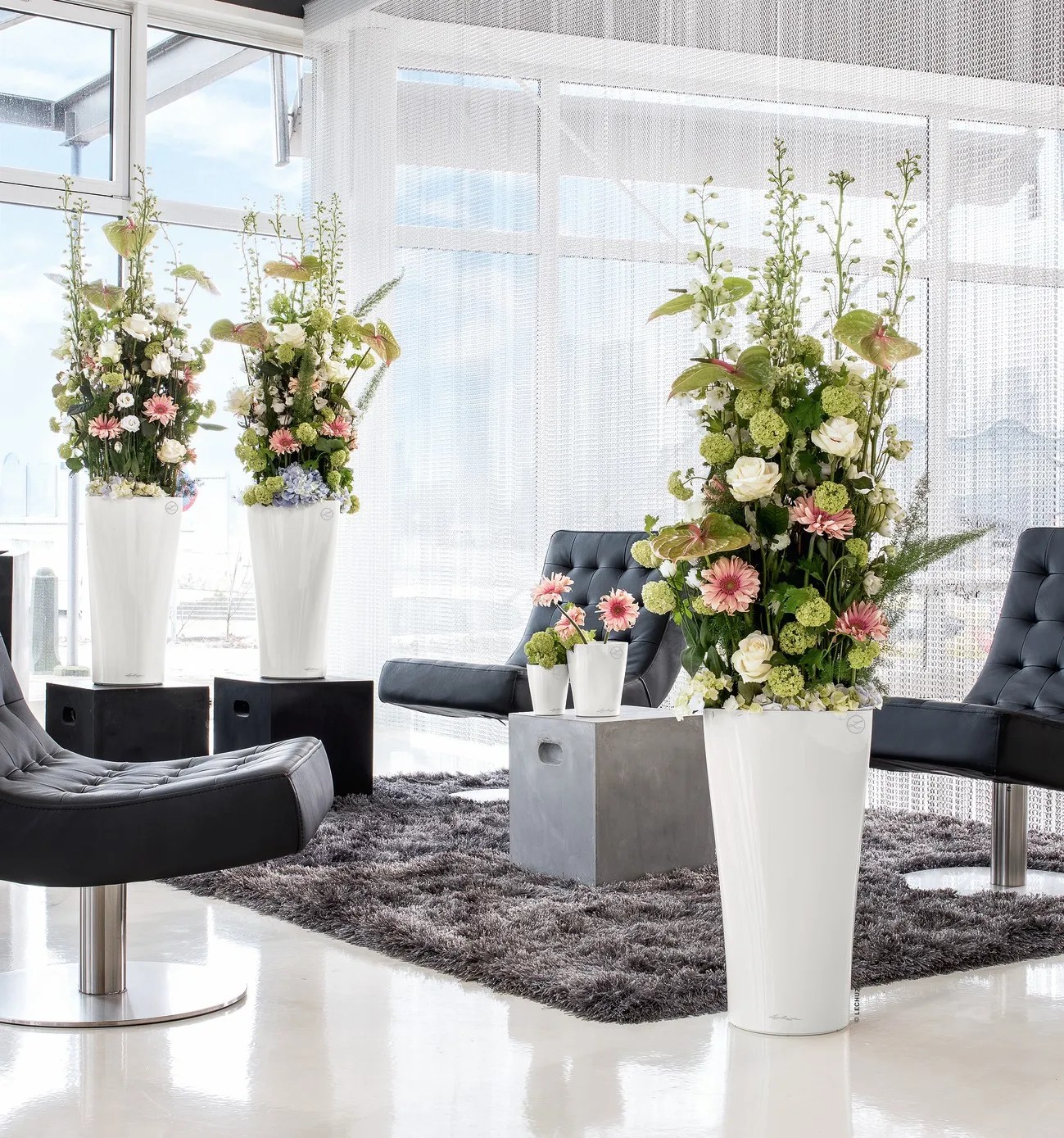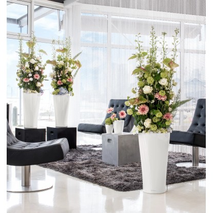 Vyjímatelná vložka s držákem v barvě nádoby umožňuje rychlou výměnu rostlin. Plynulý tvar nádoby se zaoblenými rohy představuje kvalitní základ pro exkluzivní aranžmá rostlin.