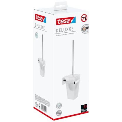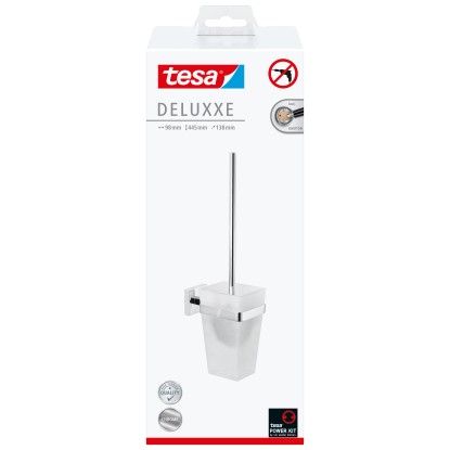 Koupelnové předměty Tesa ze série Deluxxe zaujmou svým vytříbeným designem spojeným s kvalitou a funkčností. V moderním chromu se skvěle hodí do každé koupelny nebo toalety pro hosty. A co víc, praktické koupelnové předměty jsou nerezové. Se sadou toaletních kartáčů Tesa Deluxxe snadno uložíte toaletní kartáč na stěnu, kde nepřekáží při utírání a čištění. Nádoba z matného skla je vyjímatelná pro snadné čištění. WC kartáč, který je součástí dodávky, má také vyměnitelnou hlavici kartáčku.