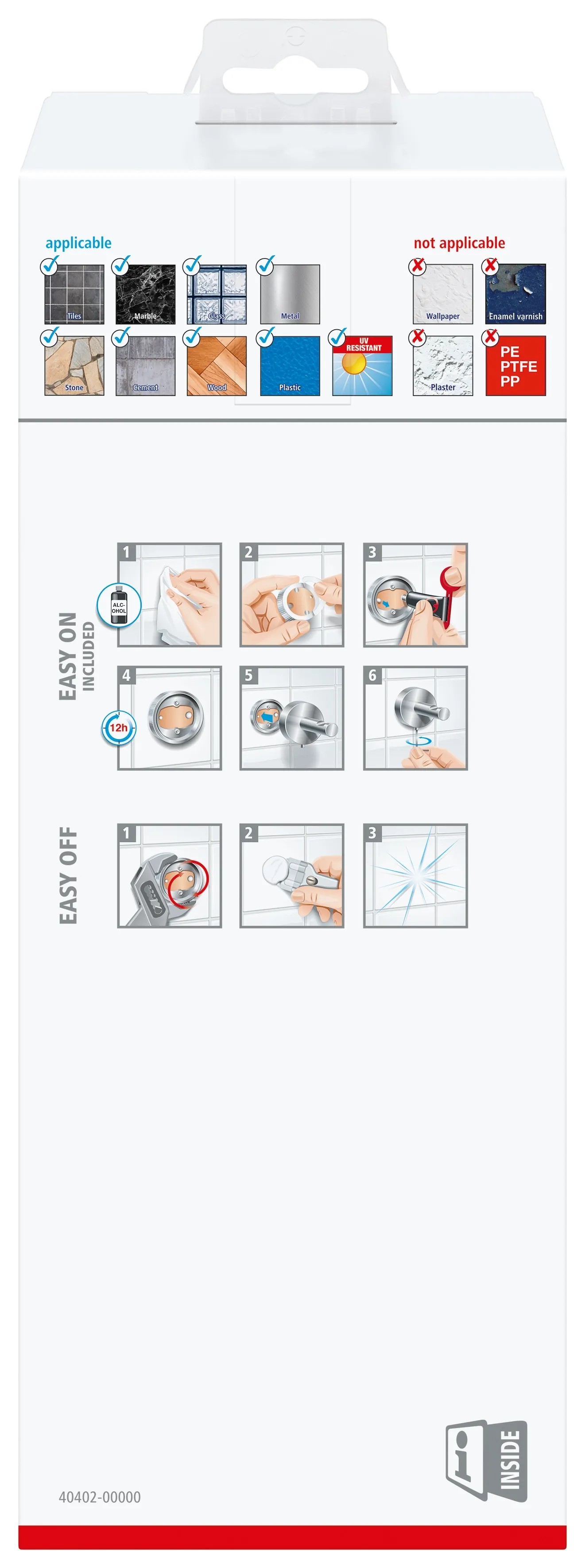 Předmět lze snadno a čistě připevnit na zeď bez vrtání nebo šroubování. Poté, co nasadíte montážní adaptér a naplníte jej lepidlem, které je součástí dodávky, počkejte 12 hodin a poté můžete položku bezpečně připevnit natrvalo. Přiložená upevňovací sada obsahuje upevňovací adaptér, lepidlo a imbusový klíč pro fixaci. Předmět je vhodný pro připevnění na dlaždice, kov, přírodní kámen, mramor, sklo, dřevo a mnoho plastů. I přes přídržnou sílu až 6 kg jej můžete kdykoli vyjmout a znovu použít s novým adaptérem (BK20).