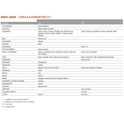 WC sedátko alca A604 je vyrobeno z Duroplastu, barevně stálého materiálu s antibakteriálními vlastnosti, které jsou zajištěny obsahem sloučenin stříbra. WC prkénko disponuje bezpečnostním zpomalovacím systémem zavírání SOFTCLOSE a kovovými panty s bílou plastovou krytkou, které jsou univerzálně stavitelné ve dvou osách. WC sedátko alca A604 se montuje pomocí systému CLICK, který taktéž zajišťuje lehké čištění keramiky, díky rychlému odejmutí sedátka.