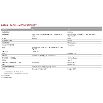 WC sedátko alca A674S je vyrobeno z duroplastu s antibakteriálními vlastnostmi. Je vybavené systémy CLICK a SOFTCLOSE. Kovové panty s bílou plastovou krytkou univerzálně stavitelné ve dvou osách. Možnost dotažení pantu šroubovákem shora.
